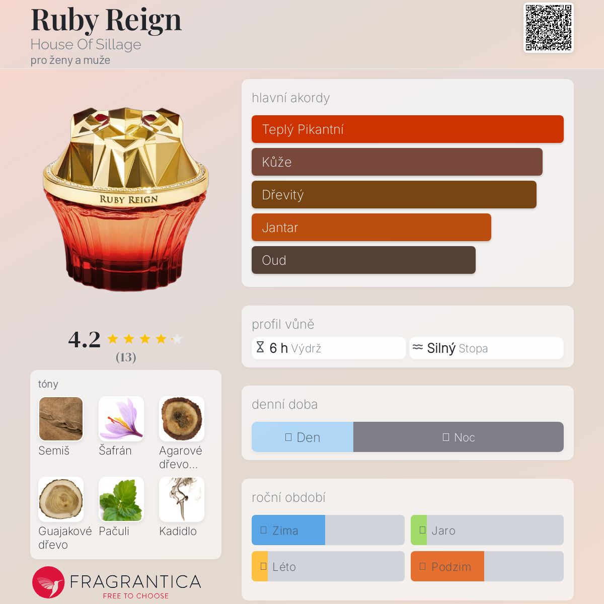 Ruby Reign podle House Of Sillage je vůně pro ženy a muže. Ruby Reign byl/a uveden/a v roce 2022. "Nosem" za touto vůní je Maud Chabanis. Vrchní tóny jsou Šafrán, Cedrové jehly, Růže a Bergamot; střední tóny jsouSemiš, Agarové dřevo (oud), Guajakové dřevo a Pomerančový květ ; základní tóny jsou Pačuli, Kadidlo, Jantar (ambra), Cedr, Fazole tonka a Pižmo.