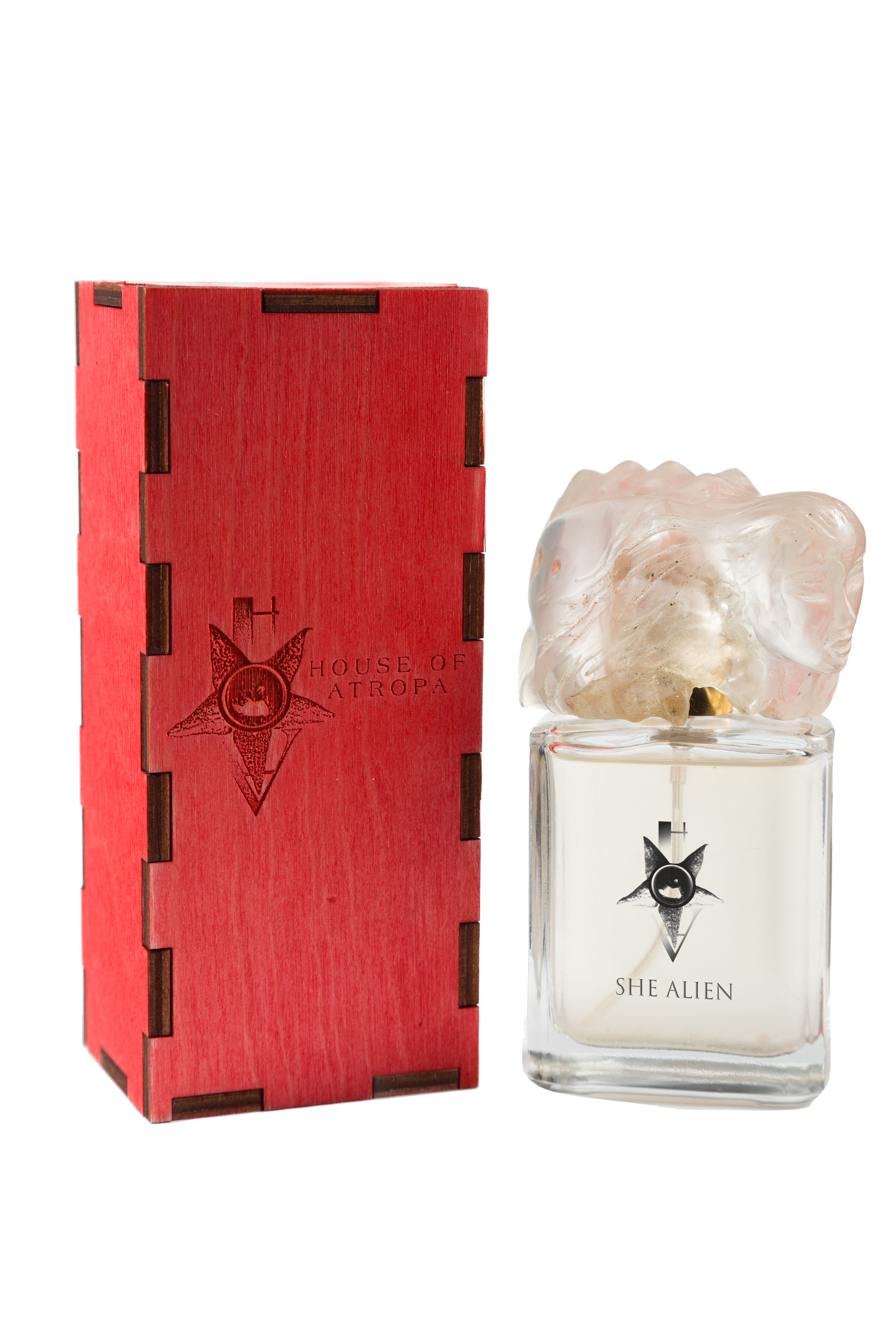 She Alien podle House of Atropa je Orientální Vanilla vůně pro ženy a muže. She Alien byl/a uveden/a v roce 2023. "Nosem" za touto vůní je Lisa Andrék. Vrchní tóny jsou Zelený čaj, Růže a Lékořice; střední tóny jsouZelený čaj, Cypřišek tupolistý, Růže a Lékořice ; základní tóny jsou Pelyněk a Cypřiš.