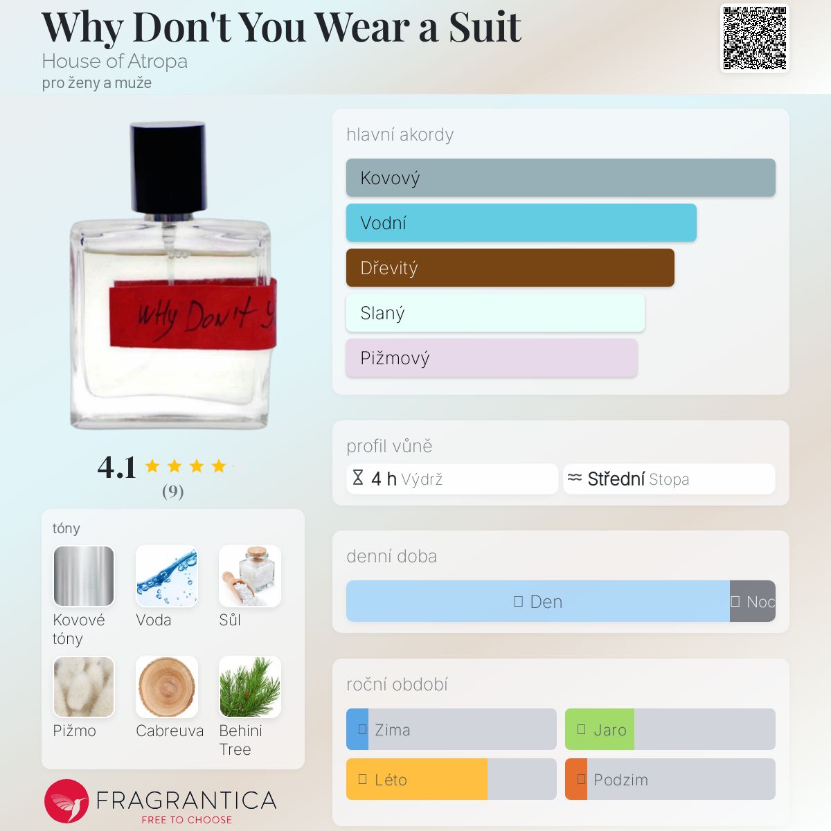 Why Don't You Wear a Suit podle House of Atropa je Woody Aquatic vůně pro ženy a muže. Toto je nová vůně. Why Don't You Wear a Suit byl/a uveden/a v roce 2025. "Nosem" za touto vůní je Lisa Andrék. Vrchní tóny jsou Kovové tóny, Vodnaté tóny, Sůl, Pižmo a Citrón; střední tóny jsouKovové tóny, Cabreuva, Behenový strom, Jasmín, Cedr, Kouř, Slaměnka a Mech ; základní tóny jsou Pižmo, Agarové dřevo (oud) a Černý smrk.