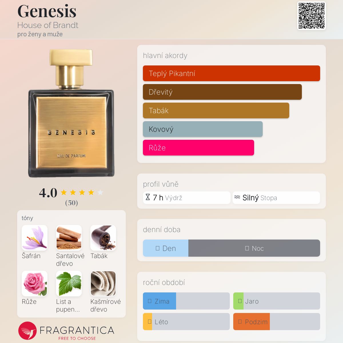 Genesis podle House of Brandt je Orientální Spicy vůně pro ženy a muže. Toto je nová vůně. Genesis byl/a uveden/a v roce 2023. "Nosem" za touto vůní je Kamila Lelakova. Vrchní tóny jsou Šafrán a Černý rybíz; střední tóny jsouRůže a Javanol ; základní tóny jsou Santalové dřevo, Tabák a Kašmírové dřevo.