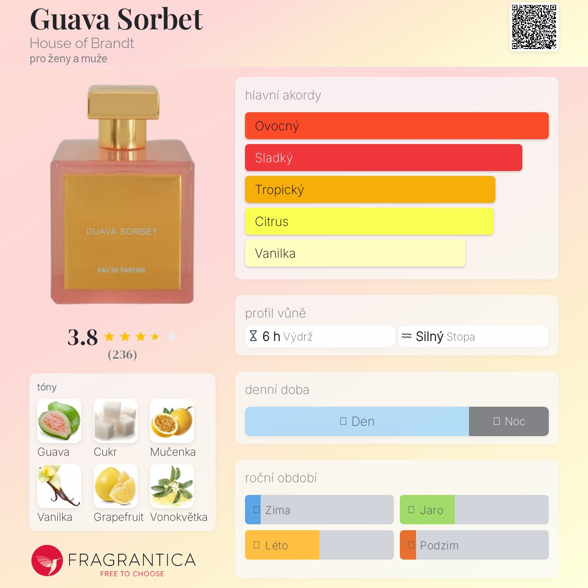 Guava Sorbet podle House of Brandt je vůně pro ženy a muže. Toto je nová vůně. Guava Sorbet byl/a uveden/a v roce 2024. "Nosem" za touto vůní je Kamila Lelakova. Vrchní tóny jsou Guava, Mučenka, Grapefruit, Mandarinka a Bergamot; střední tóny jsouGuava, Cukr, Vonokvětka a Jasmín ; základní tóny jsou Vanilka, Santalové dřevo, Jantar (ambra) a Pižmo.