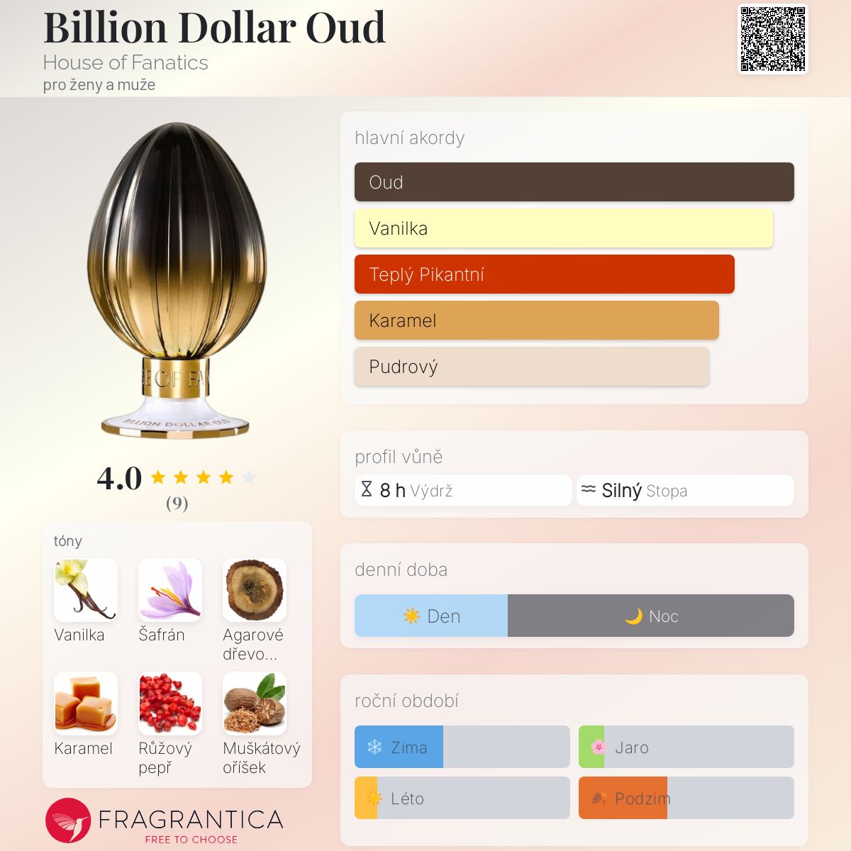 Billion Dollar Oud podle House of Fanatics je Orientální Woody vůně pro ženy a muže. Toto je nová vůně. Billion Dollar Oud byl/a uveden/a v roce 2024. Vrchní tóny jsou Šafrán, Růžový pepř a Muškátový oříšek; střední tóny jsouKaramel, Kašmír a Dřevo akigala ; základní tóny jsou Vanilka, Agarové dřevo (oud) a Jantar (ambra).