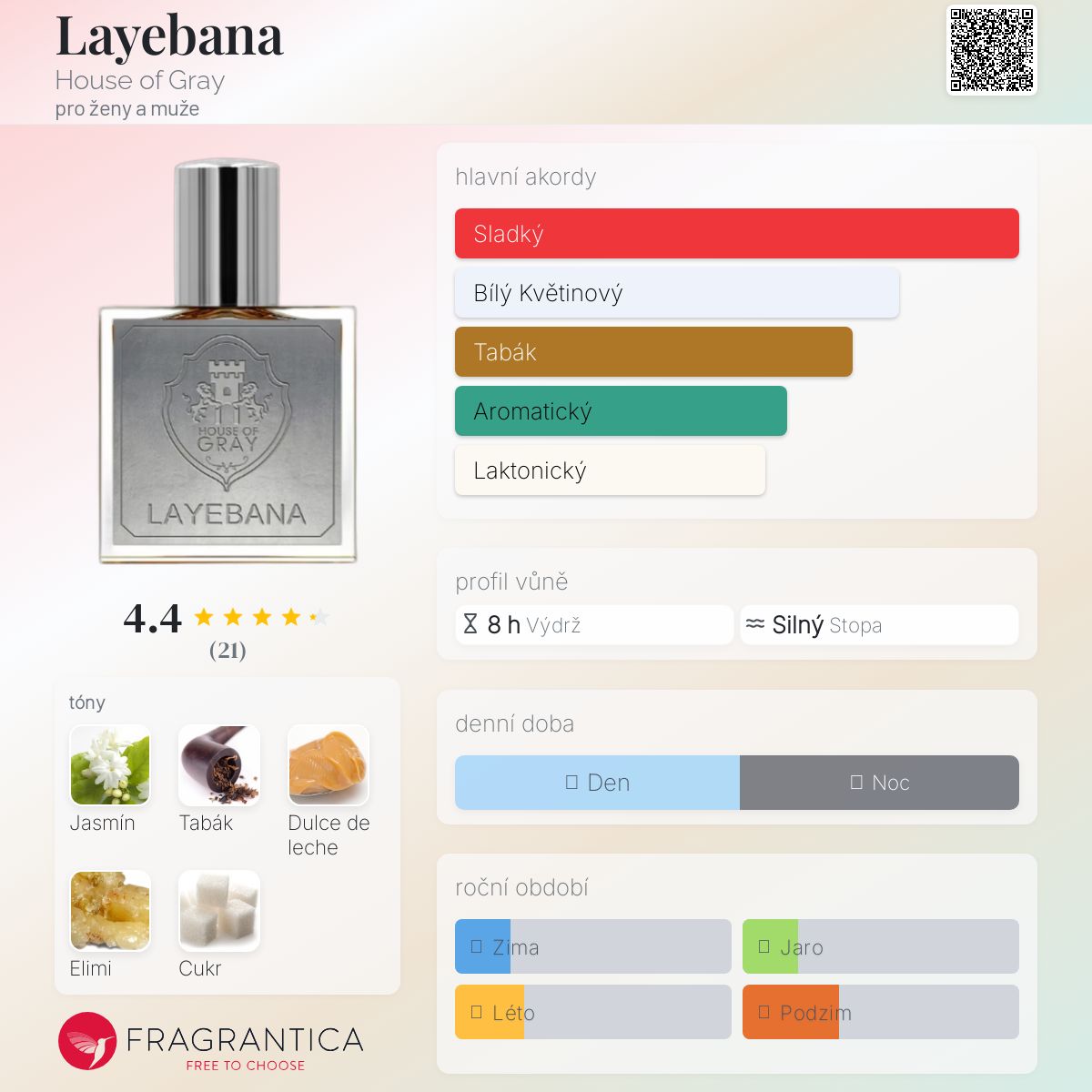 Layebana podle House of Gray je Orientální Floral vůně pro ženy a muže. Layebana byl/a uveden/a v roce 2018. Layebana byl/a vytvořen/a Eugene Au a Emrys Au.
