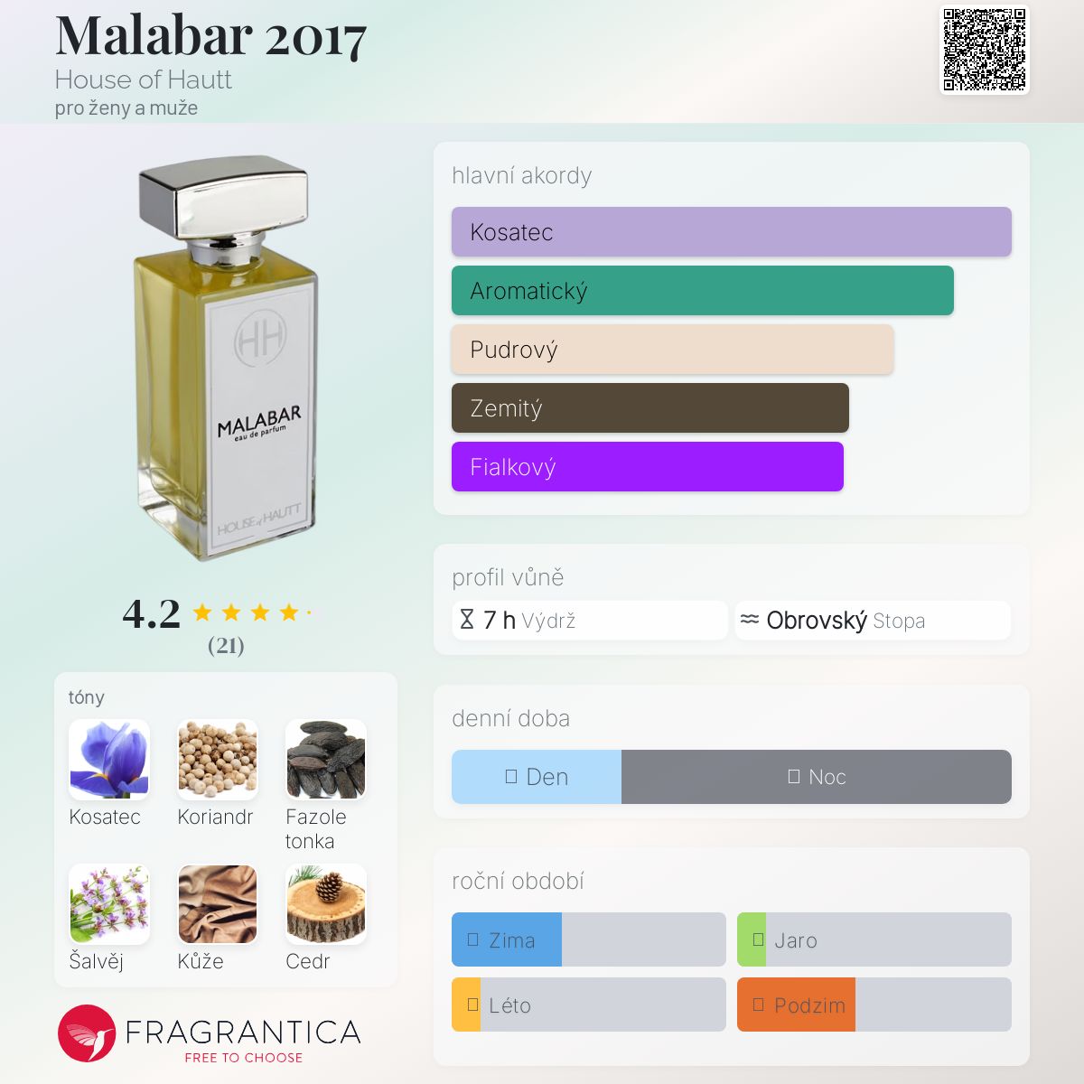 Malabar 2017 podle House of Hautt je Leather vůně pro ženy a muže. Malabar 2017 byl/a uveden/a v roce 2017. "Nosem" za touto vůní je Edison Fujita. Vrchní tóny jsou Šalvěj, Mandarinka a Bergamot; střední tóny jsouKosatec, Koriandr, Fazole tonka a Kardamom ; základní tóny jsou Kůže, Cedr, Jantar (ambra), Dubový mech a Vanilka.