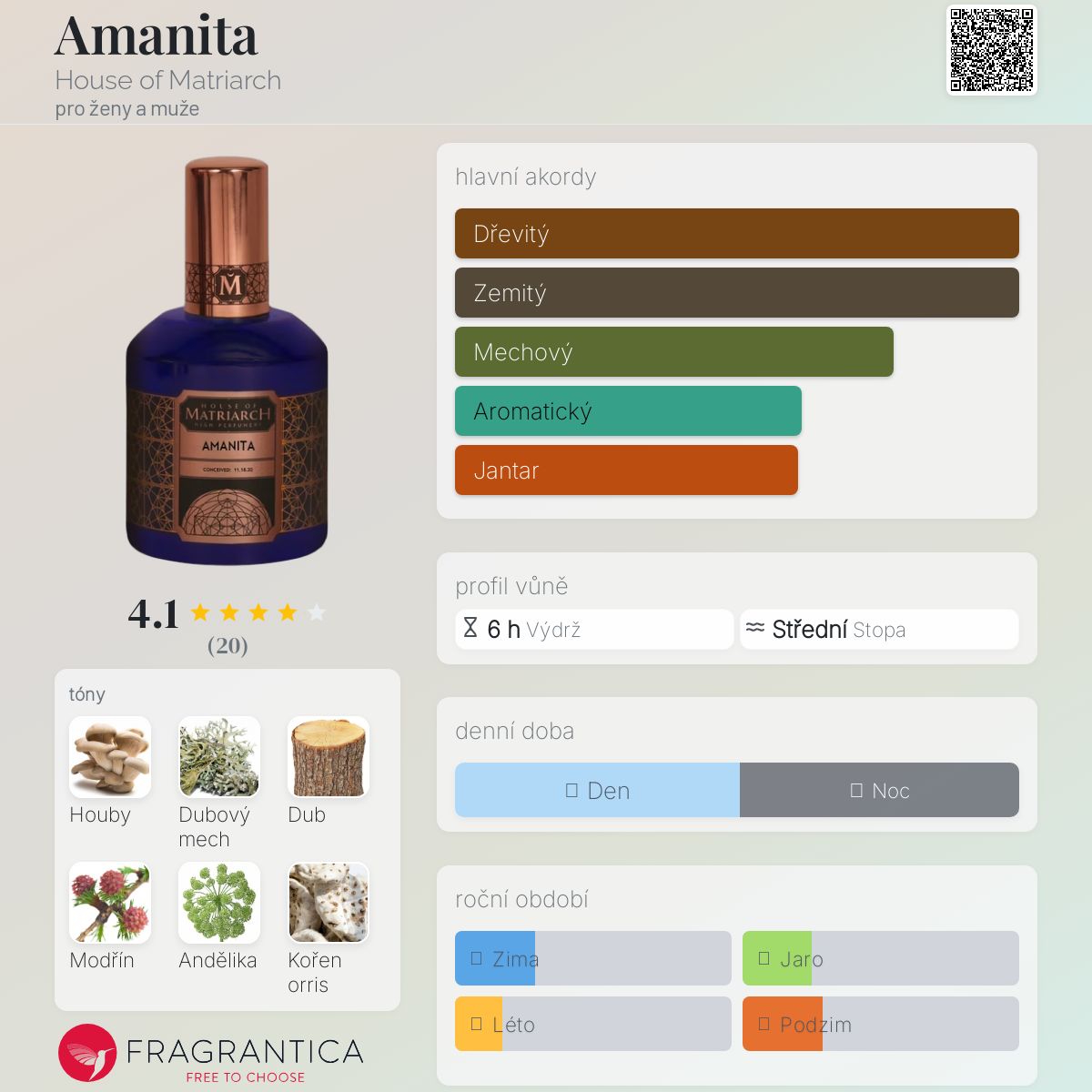 Amanita podle House of Matriarch je Orientální Woody vůně pro ženy a muže. Amanita byl/a uveden/a v roce 2022. "Nosem" za touto vůní je Christi Meshell. Vrchní tóny jsou Mech, Andělika, Šafrán a Srst; střední tóny jsouHouby, Dub a Modřín ; základní tóny jsou Orris, Agarové dřevo (oud), Peruánský balzám a Vetiver.