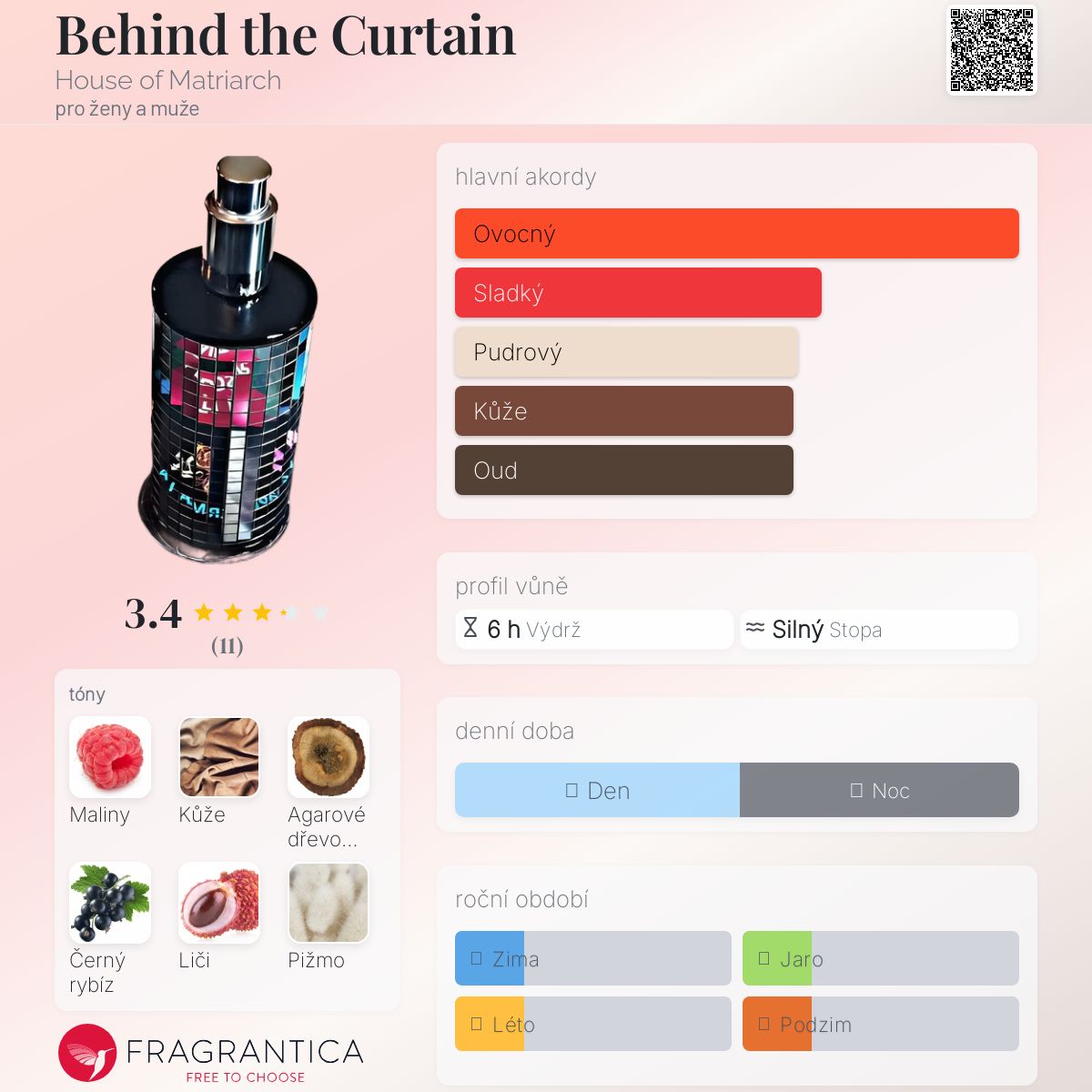 Behind the Curtain podle House of Matriarch je Floral Woody Musk vůně pro ženy a muže. Behind the Curtain byl/a uveden/a v roce 2015. "Nosem" za touto vůní je Christi Meshell. Vrchní tóny jsou Maliny, Černý rybíz, Černý bez a Zimolez; střední tóny jsouKůže, Liči, Kasie, Pivoňka, Bílý jantar (ambra), Ylang-Ylang a Exotická dřeva ; základní tóny jsou Agarové dřevo (oud), Bílé pižmo, Kořen orris, Pudrové tóny, Vanilka a Pačuli.