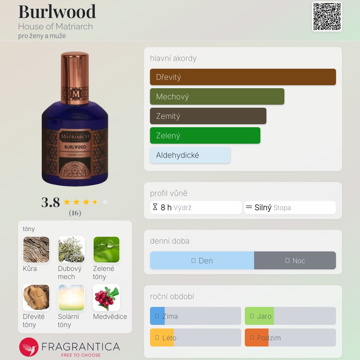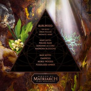 Burlwood podle House of Matriarch je vůně pro ženy a muže. Burlwood byl/a uveden/a v roce 2021. "Nosem" za touto vůní je Christi Meshell. Vrchní tóny jsou Zelené listí a Bylinné tóny; střední tóny jsouKůra, Solární tóny a Medvědice ; základní tóny jsou Dubový mech, Dřevité tóny a Jantar (ambra).