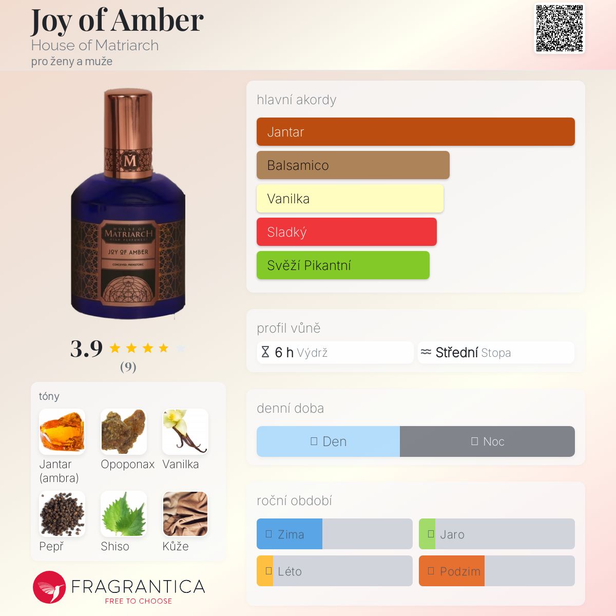 Joy of Amber podle House of Matriarch je Orientální vůně pro ženy a muže. Toto je nová vůně. Joy of Amber byl/a uveden/a v roce 2024. "Nosem" za touto vůní je Christi Meshell. Vrchní tóny jsou Bílý pepř, Shiso, Fazole tonka, Skalní růže a Muškátový květ; střední tóny jsouKůže, Pižmo, Kadidlo, Skalní růže, Janovec a Neroli ; základní tóny jsou Jantar (ambra), Opoponax, Madagaskarská vanilka a Pryskyřice.