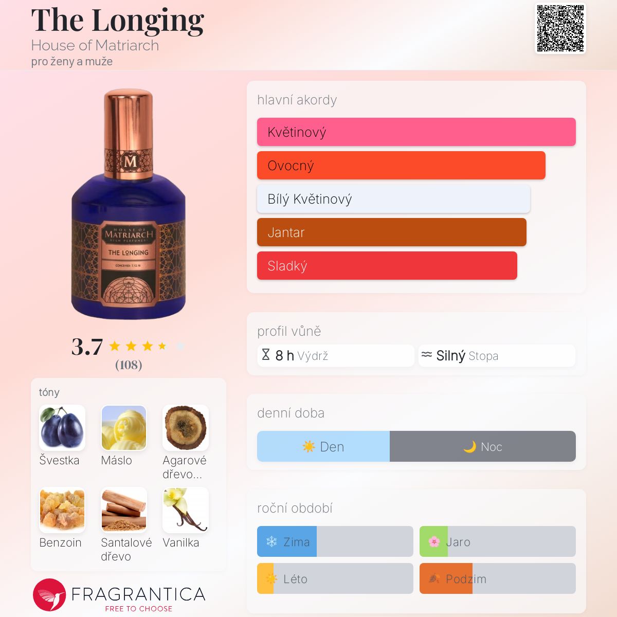 The Longing podle House of Matriarch je Orientální Floral vůně pro ženy a muže. The Longing byl/a uveden/a v roce 2017. "Nosem" za touto vůní je Christi Meshell. Vrchní tóny jsou Švestka, Máslo, Agarové dřevo (oud), Jasmín a Boronia; střední tóny jsouVonokvětka, Med, Gardénie, Vanilková orchidej a Pomerančový květ ; základní tóny jsou Benzoin, Santalové dřevo, Vanilka, Kůže, Jantar (ambra) a Ambrette (přírodní pižmo).