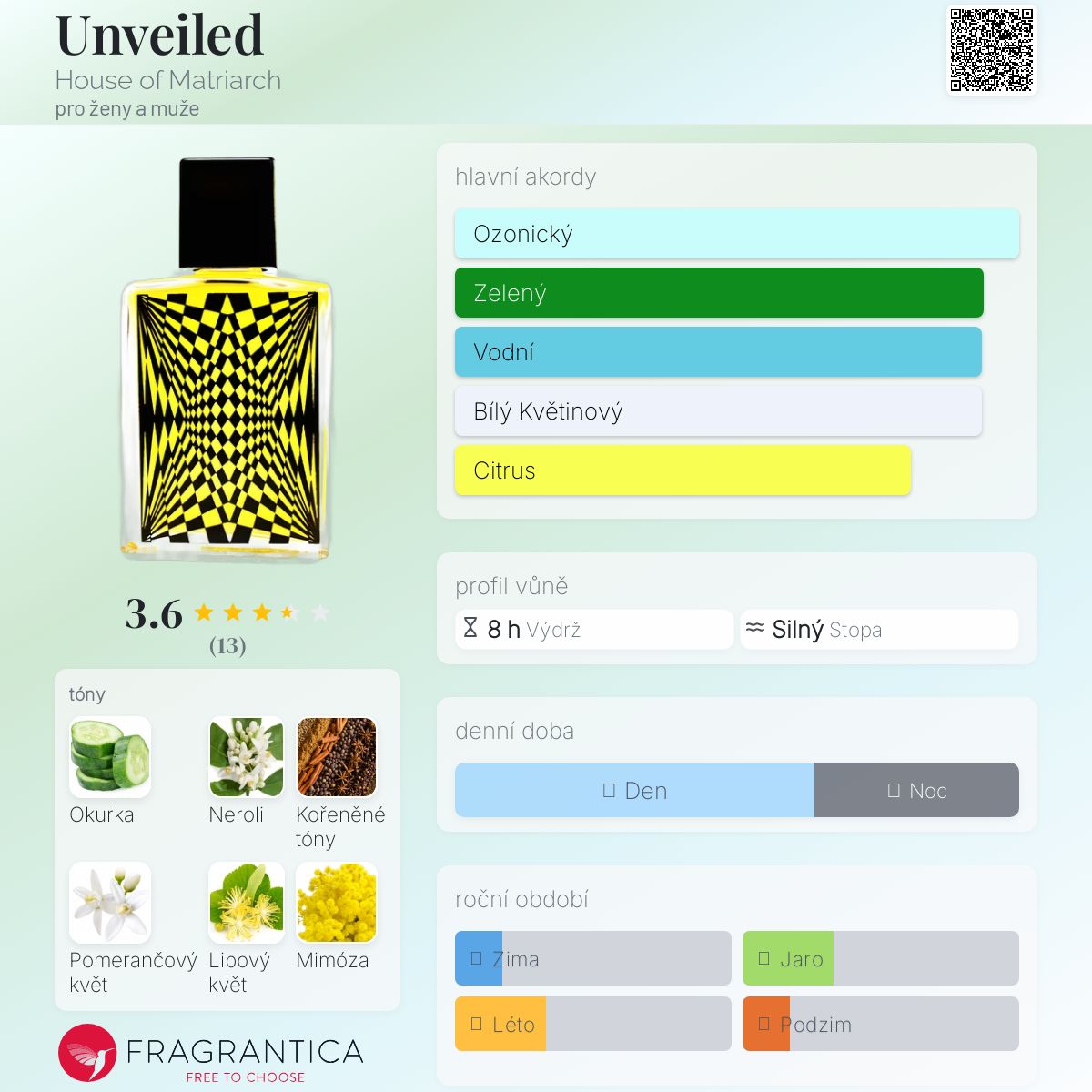 Unveiled podle House of Matriarch je Citrus vůně pro ženy a muže. Unveiled byl/a uveden/a v roce 2013. "Nosem" za touto vůní je Christi Meshell.
