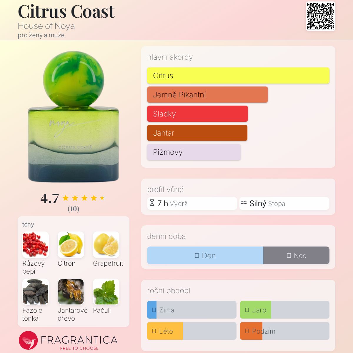 Citrus Coast podle House of Noya je Woody Aromatic vůně pro ženy a muže. Toto je nová vůně. Citrus Coast byl/a uveden/a v roce 2025. "Nosem" za touto vůní je Jean-Louis Sieuzac. Vrchní tóny jsou Růžový pepř, Citrón a Grapefruit; střední tón jeJalovcové bobulky ; základní tóny jsou Fazole tonka, Jantarové dřevo a Pačuli.