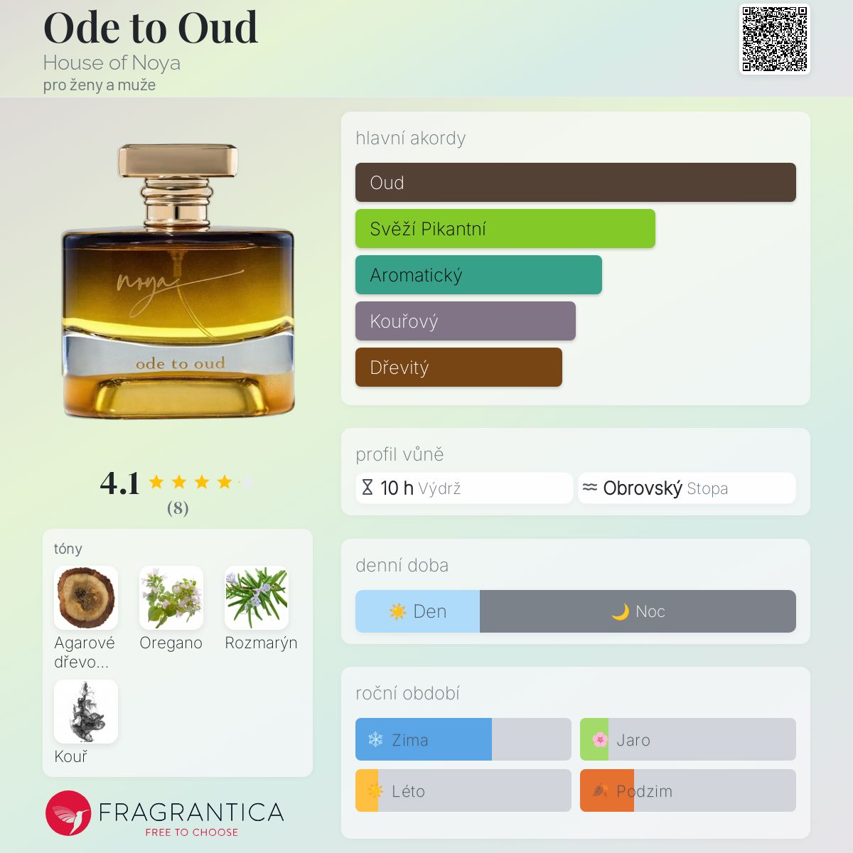 Ode to Oud podle House of Noya je Orientální Woody vůně pro ženy a muže. Ode to Oud byl/a uveden/a v roce 2023. "Nosem" za touto vůní je Jean-Louis Sieuzac. Vrchní tón je Oregano ; střední tón jeRozmarýn ; základní tóny jsou Agarové dřevo (oud) a Kouř.