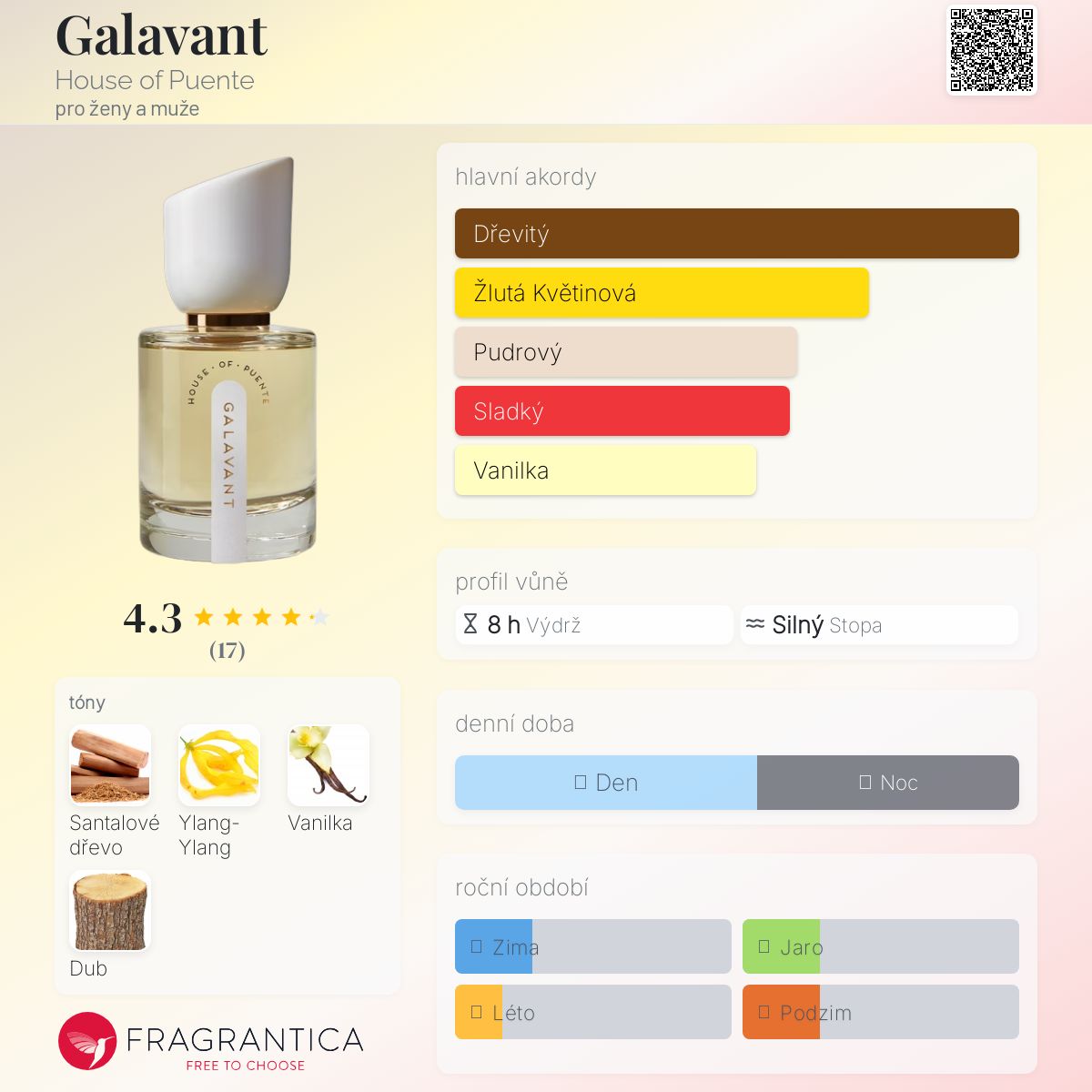 Galavant podle House of Puente je Floral vůně pro ženy a muže. Toto je nová vůně. Galavant byl/a uveden/a v roce 2024. "Nosem" za touto vůní je Eliam Puente.