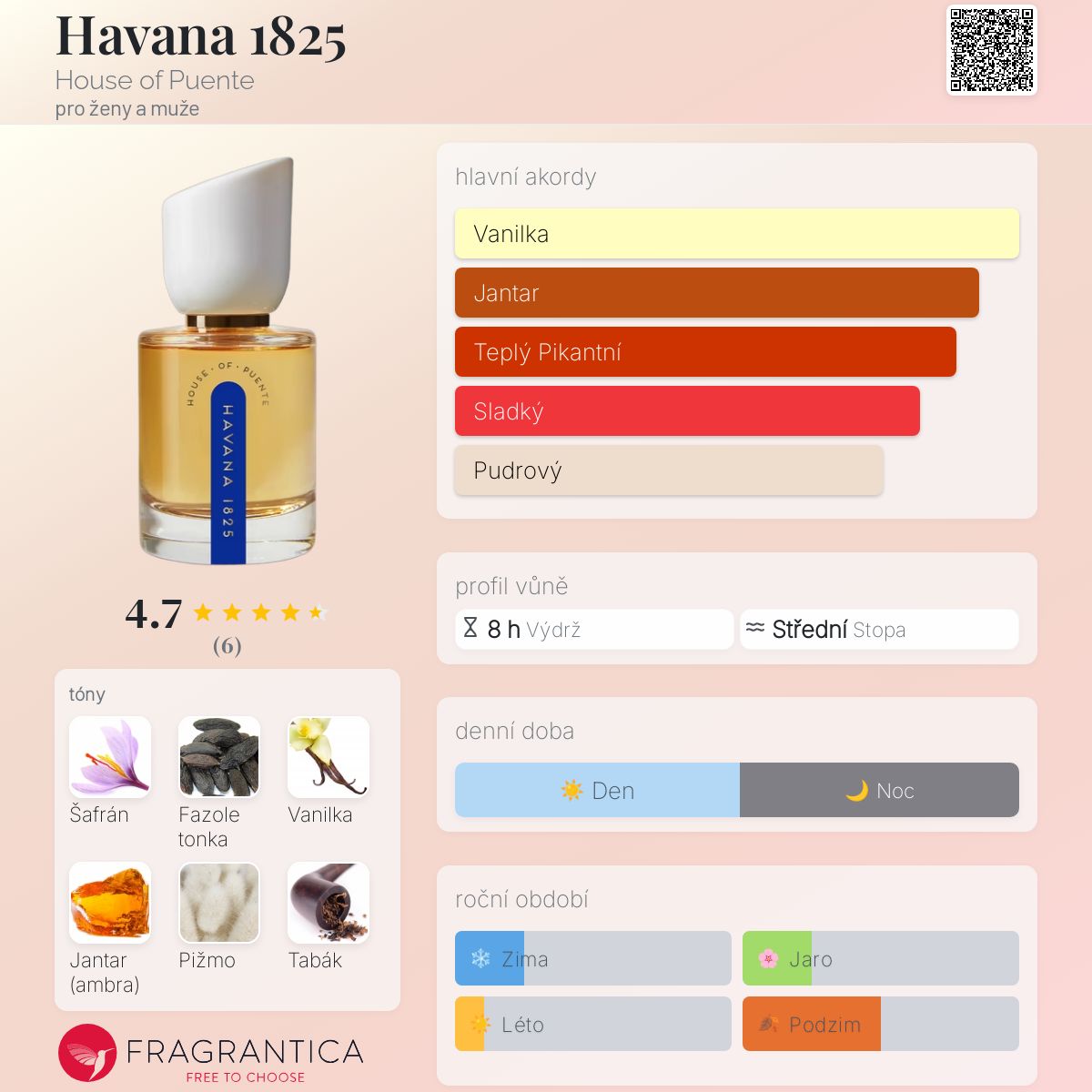 Havana 1825 podle House of Puente je Orientální Floral vůně pro ženy a muže. Toto je nová vůně. Havana 1825 byl/a uveden/a v roce 2025. Vrchní tóny jsou Šafrán, Ylang-Ylang a Citrusy; střední tóny jsouVirginský cedr, Růže de Mai, Jasmín a Hřebíček ; základní tóny jsou Fazole tonka, Vanilka, Jantar (ambra), Pižmo, Tabák a Kůže.