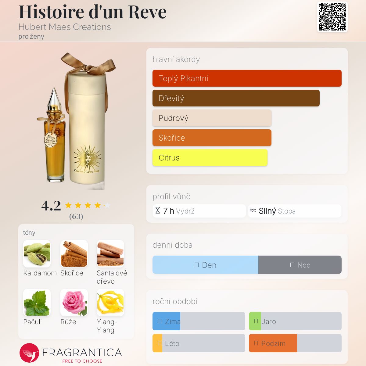 Histoire d'un Reve podle Hubert Maes Creations je Chypre Floral vůně pro ženy. Histoire d'un Reve byl/a uveden/a v roce 2007. "Nosem" za touto vůní je Hubert Maes. Vrchní tóny jsou Kardamom, Bergamot a Mandarinka; střední tóny jsouSkořice, Růže, Ylang-Ylang, Kosatec a Jasmín ; základní tóny jsou Santalové dřevo, Pačuli, Vanilka a Virginský cedr.