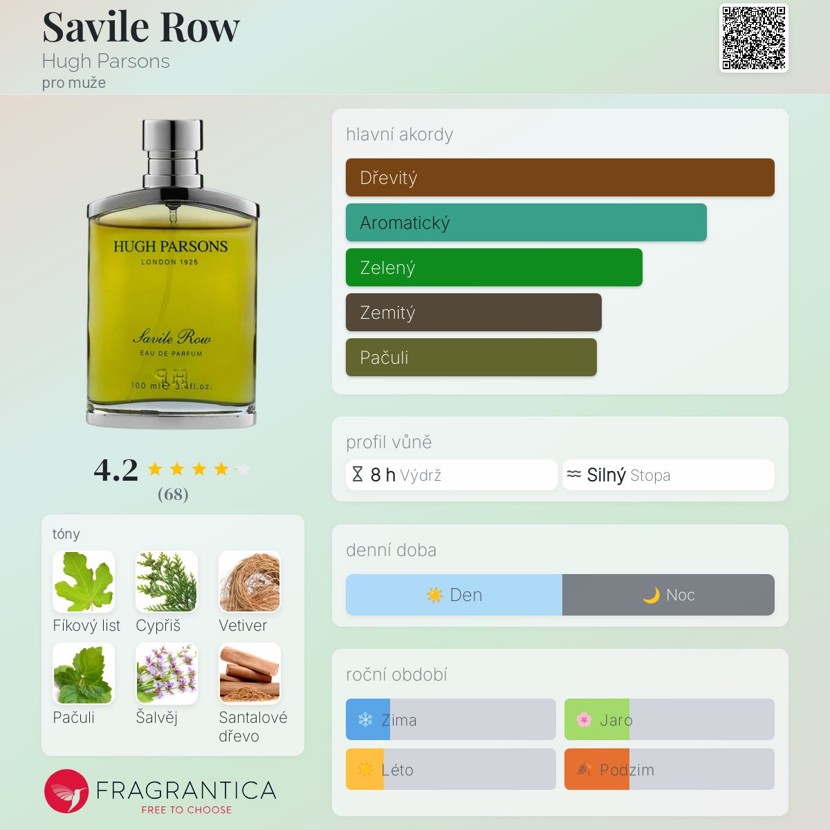 Savile Row podle Hugh Parsons je Woody Aromatic vůně pro muže. Savile Row byl/a uveden/a v roce 2021. Vrchní tón je Cypřiš ; střední tóny jsouFíkový list a Šalvěj ; základní tóny jsou Vetiver, Pačuli, Santalové dřevo a Pižmo.