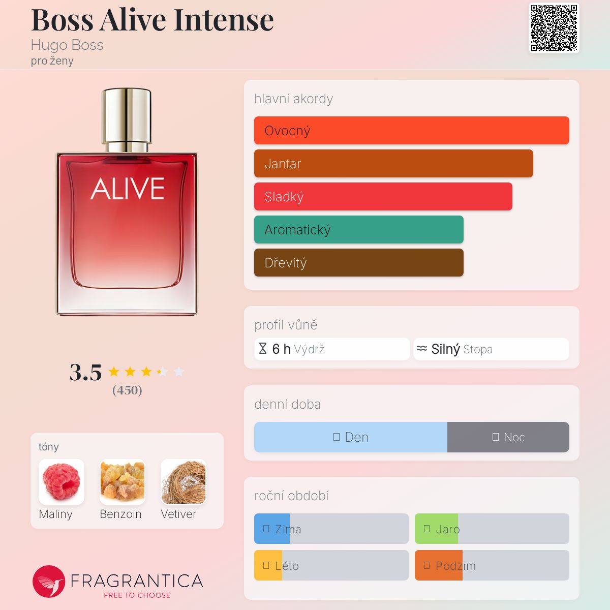 Boss Alive Intense podle Hugo Boss je Orientální Woody vůně pro ženy. Boss Alive Intense byl/a uveden/a v roce 2022. Vrchní tón je Maliny ; střední tón jeVetiver ; základní tón je Benzoin.