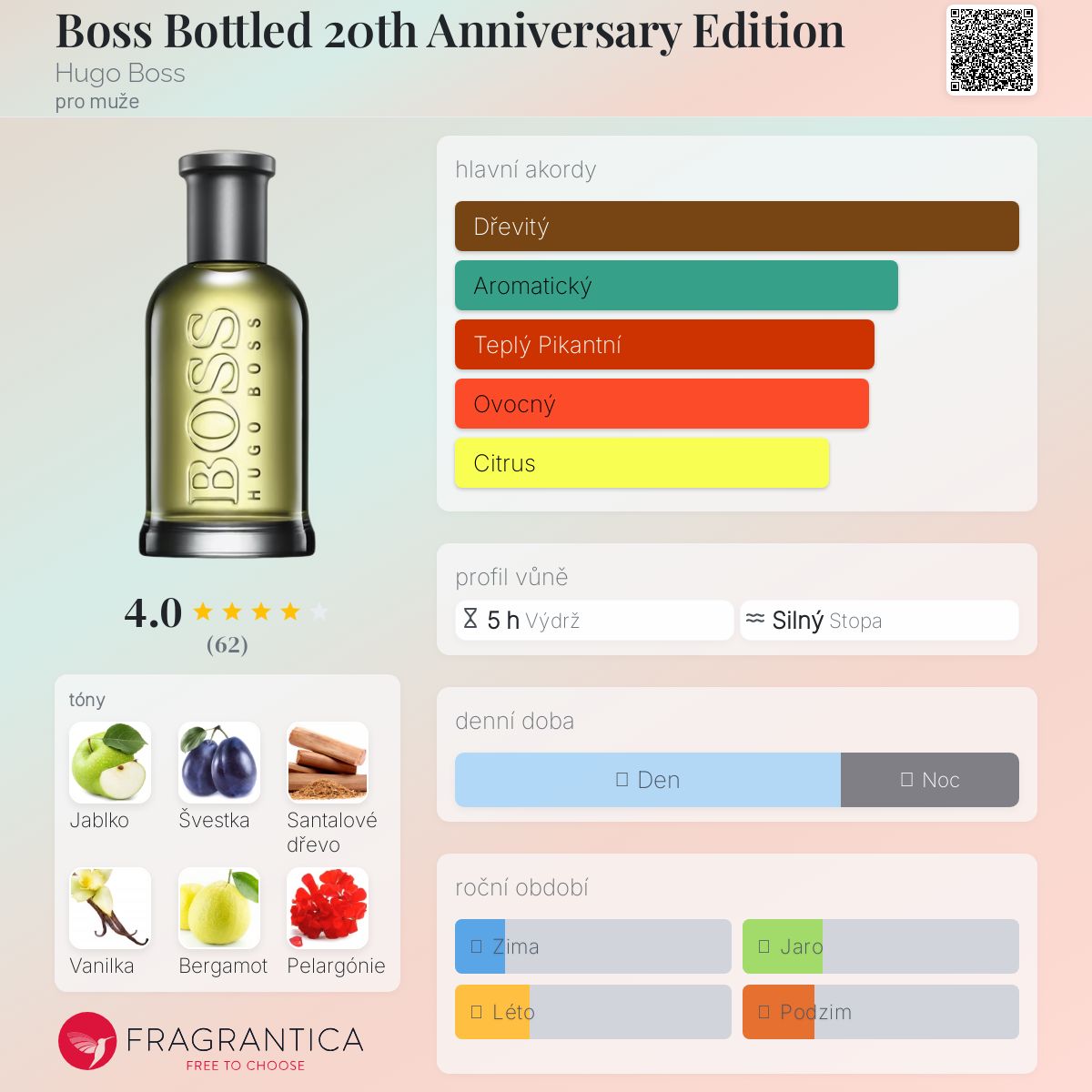 Boss Bottled 20th Anniversary Edition podle Hugo Boss je Woody Spicy vůně pro muže. Boss Bottled 20th Anniversary Edition byl/a uveden/a v roce 2018. "Nosem" za touto vůní je Annick Menardo. Vrchní tóny jsou Jablko, Švestka, Bergamot, Pelargónie, Mech a Citrón; střední tóny jsouKarafiát, Skořice a Mahagon ; základní tóny jsou Santalové dřevo, Vanilka, Olivovník, Vetiver a Cedr.
