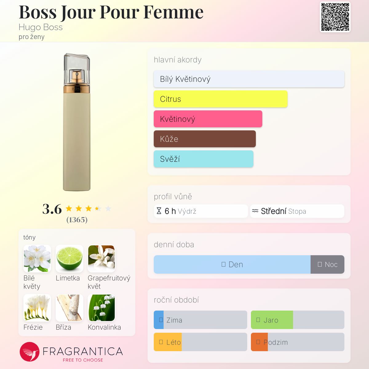 Boss Jour Pour Femme podle Hugo Boss je Floral vůně pro ženy. Boss Jour Pour Femme byl/a uveden/a v roce 2013. Vrchní tóny jsou Limetka a Grapefruitový květ; střední tóny jsouBílé květy, Frézie, Konvalinka a Zimolez ; základní tóny jsou Bříza a Jantar (ambra).