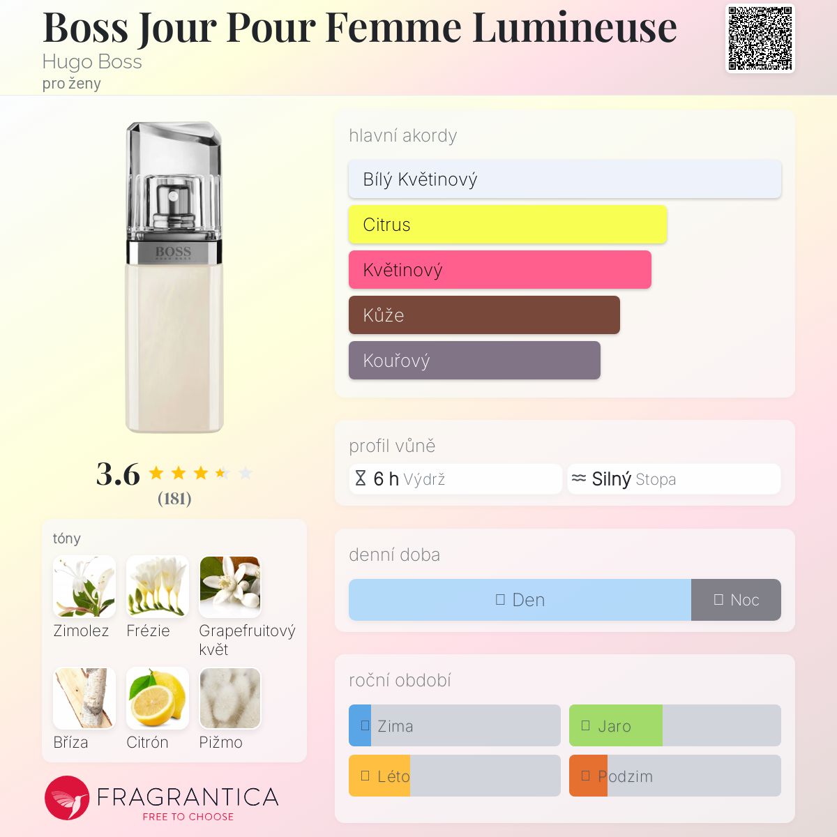 Boss Jour Pour Femme Lumineuse podle Hugo Boss je Floral vůně pro ženy. Boss Jour Pour Femme Lumineuse byl/a uveden/a v roce 2015. Vrchní tóny jsou Grapefruitový květ a Citrón; střední tóny jsouZimolez, Frézie a Konvalinka ; základní tóny jsou Bříza, Pižmo a Jantar (ambra).