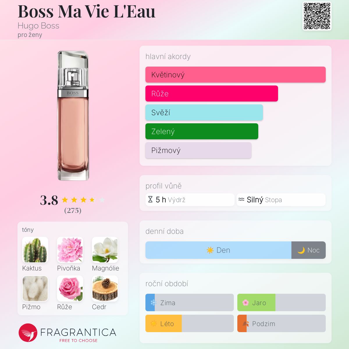 Boss Ma Vie L'Eau podle Hugo Boss je Floral vůně pro ženy. Boss Ma Vie L'Eau byl/a uveden/a v roce 2018. Vrchní tón je Kaktusový květ ; střední tóny jsouPivoňka, Magnólie a Růžová růže ; základní tóny jsou Bílé pižmo a Cedr.