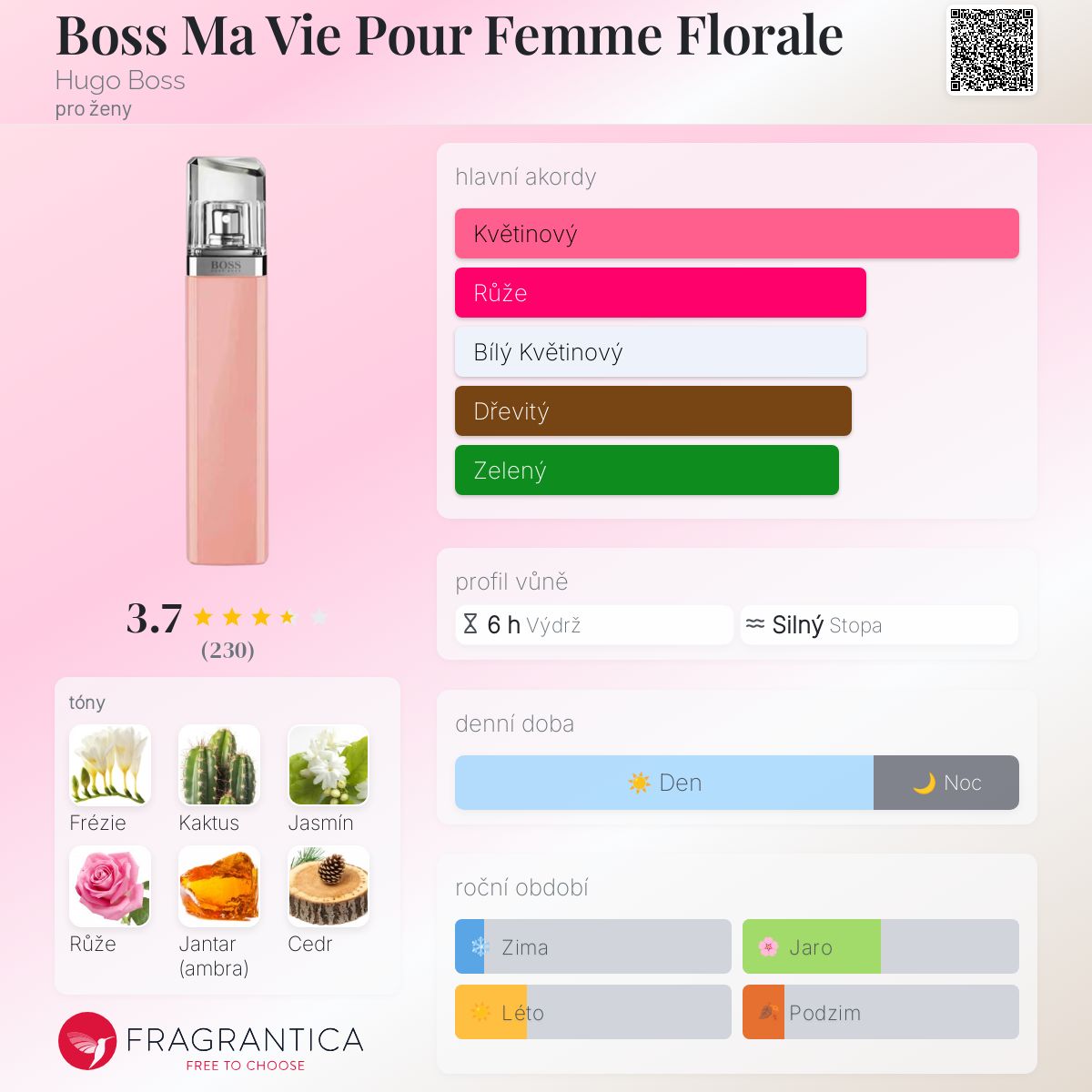 Boss Ma Vie Pour Femme Florale podle Hugo Boss je Floral vůně pro ženy. Boss Ma Vie Pour Femme Florale byl/a uveden/a v roce 2017. Vrchní tón je Kaktusový květ ; střední tóny jsouFrézie, Jasmín Sambac a Růže ; základní tóny jsou Jantar (ambra), Cedr a Santalové dřevo.