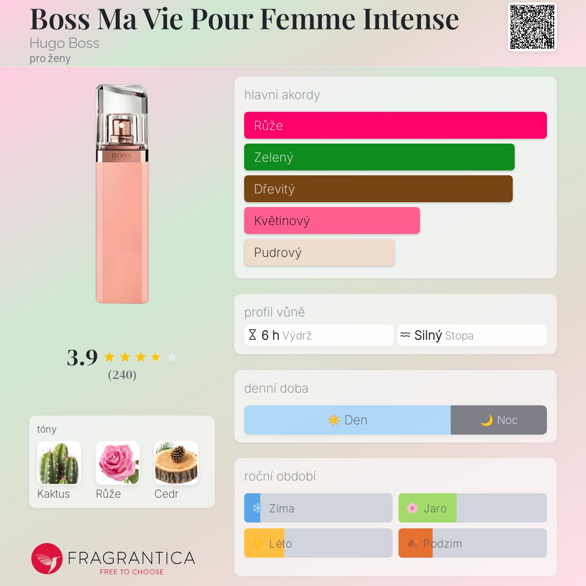 Boss Ma Vie Pour Femme Intense podle Hugo Boss je Floral vůně pro ženy. Boss Ma Vie Pour Femme Intense byl/a uveden/a v roce 2016. Vrchní tón je Kaktusový květ ; střední tón jeRůže ; základní tón je Cedr.