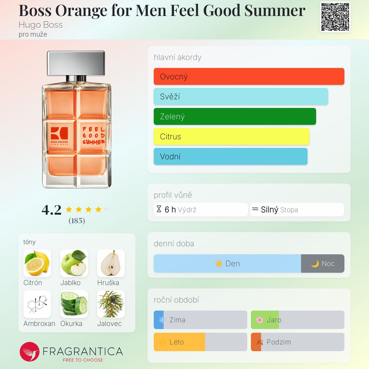 Boss Orange for Men Feel Good Summer podle Hugo Boss je Woody Aquatic vůně pro muže. Boss Orange for Men Feel Good Summer byl/a uveden/a v roce 2013. Vrchní tóny jsou Citrón, Zelené jablko a Jalovec; střední tóny jsouHruška, Okurka a Zelený čaj ; základní tóny jsou Ambroxan, Pačuli a Mech.