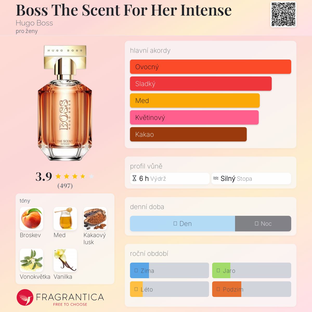 Boss The Scent For Her Intense podle Hugo Boss je Floral Fruity vůně pro ženy. Boss The Scent For Her Intense byl/a uveden/a v roce 2017. Vrchní tóny jsou Broskev a Med; střední tón jeVonokvětka ; základní tóny jsou Kakao a Vanilka.