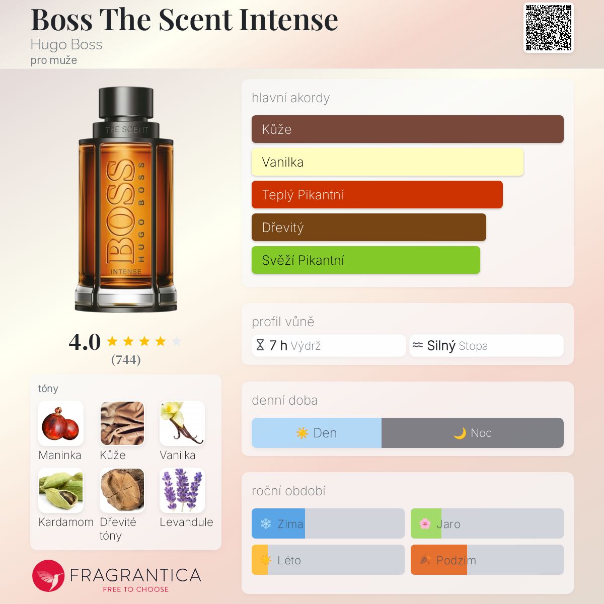 Boss The Scent Intense podle Hugo Boss je Aromatic Spicy vůně pro muže. Boss The Scent Intense byl/a uveden/a v roce 2017. Boss The Scent Intense byl/a vytvořen/a Bruno Jovanovic a Pascal Gaurin. Vrchní tóny jsou Kardamom a Zázvor; střední tóny jsouManinka a Levandule ; základní tóny jsou Kůže, Vanilka a Dřevité tóny.