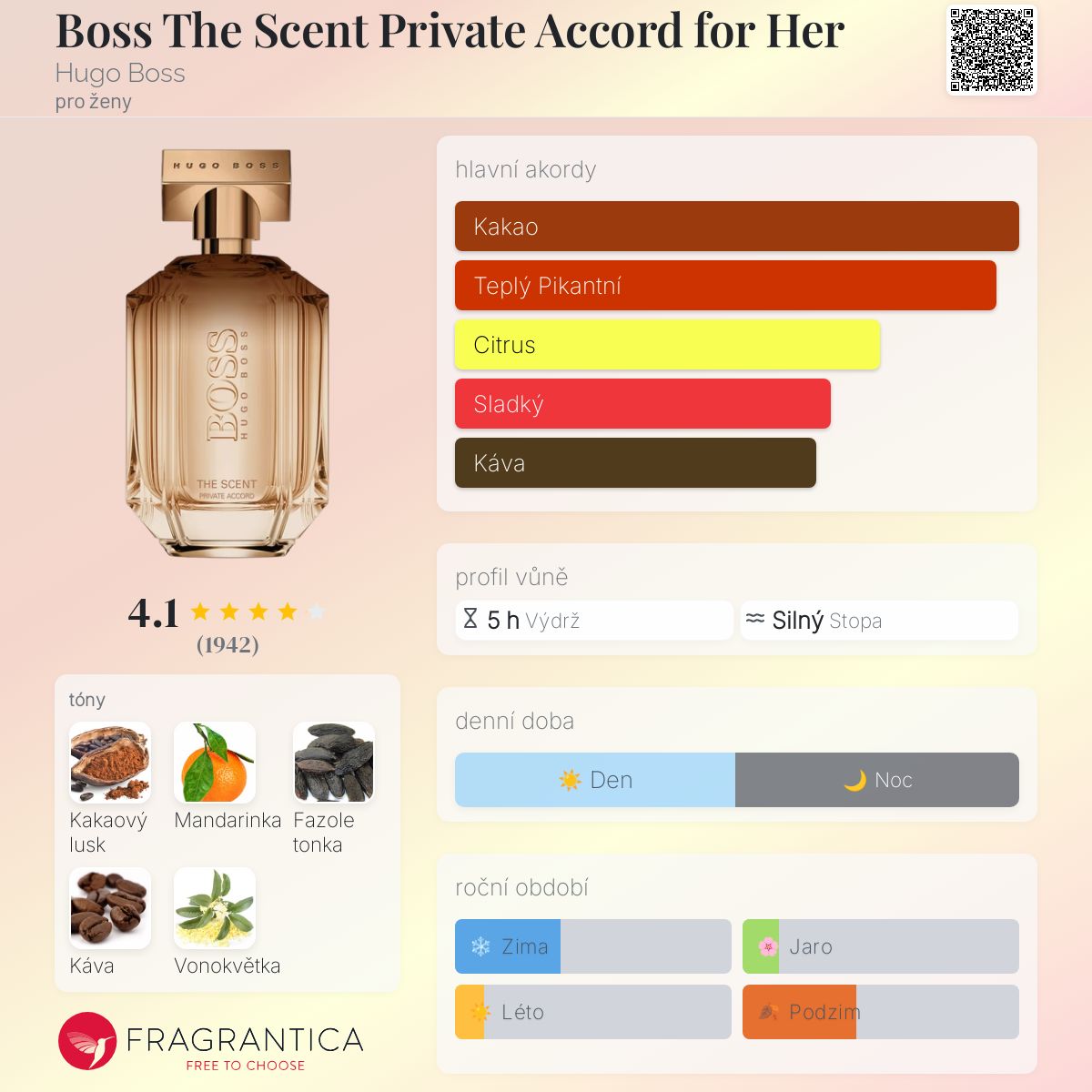 Boss The Scent Private Accord for Her podle Hugo Boss je Orientální Vanilla vůně pro ženy. Boss The Scent Private Accord for Her byl/a uveden/a v roce 2018. "Nosem" za touto vůní je Louise Turner. Vrchní tón je Mandarinka ; střední tóny jsouKáva a Vonokvětka ; základní tóny jsou Kakao a Fazole tonka.