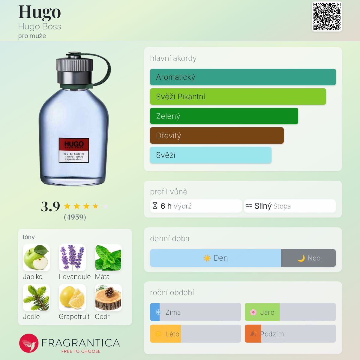 Hugo podle Hugo Boss je Aromatic Green vůně pro muže. Hugo byl/a uveden/a v roce 1995. "Nosem" za touto vůní je Bob Aliano. Vrchní tóny jsou Zelené jablko, Levandule, Máta, Grapefruit a Bazalka; střední tóny jsouŠalvěj, Pelargónie, Karafiát a Jasmín ; základní tóny jsou Jedle, Cedr a Pačuli.