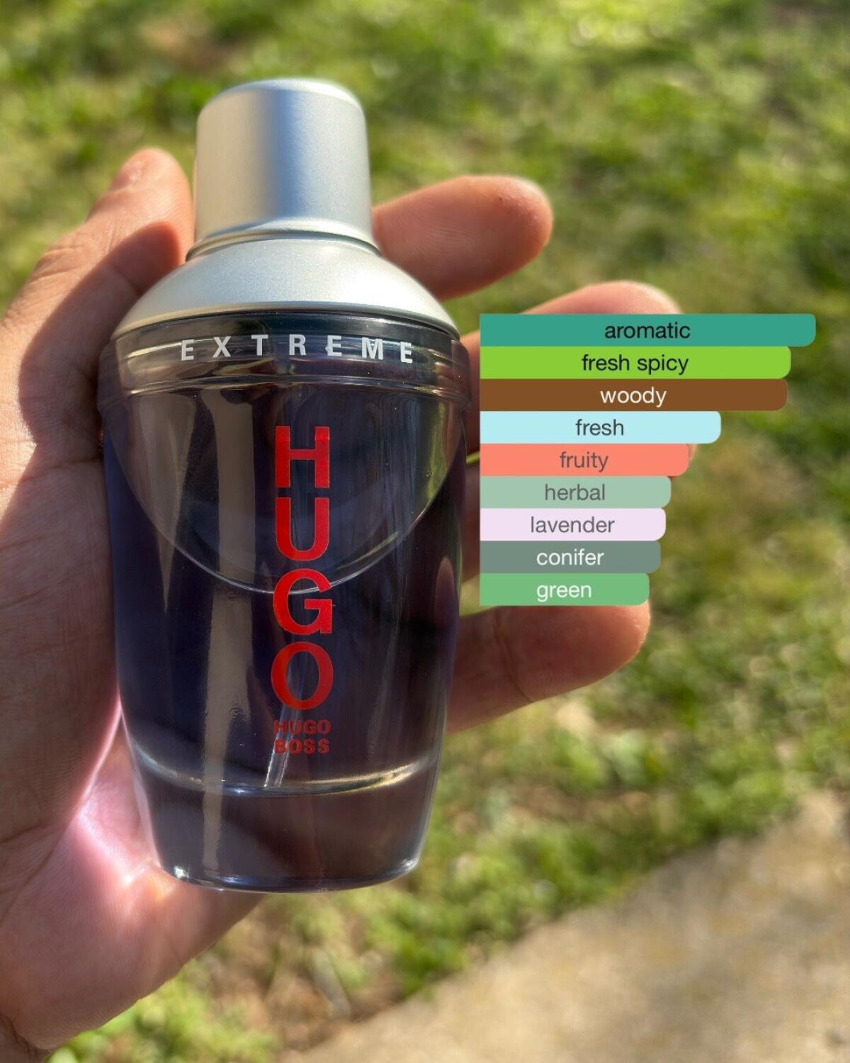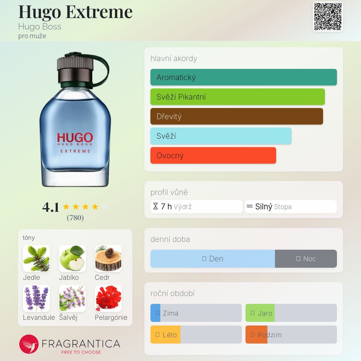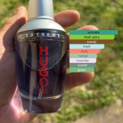 Hugo Extreme podle Hugo Boss je Aromatic Green vůně pro muže. Hugo Extreme byl/a uveden/a v roce 2016. Vrchní tón je Zelené jablko ; střední tóny jsouLevandule, Šalvěj a Pelargónie ; základní tóny jsou Jedle balzámová a Cedr.