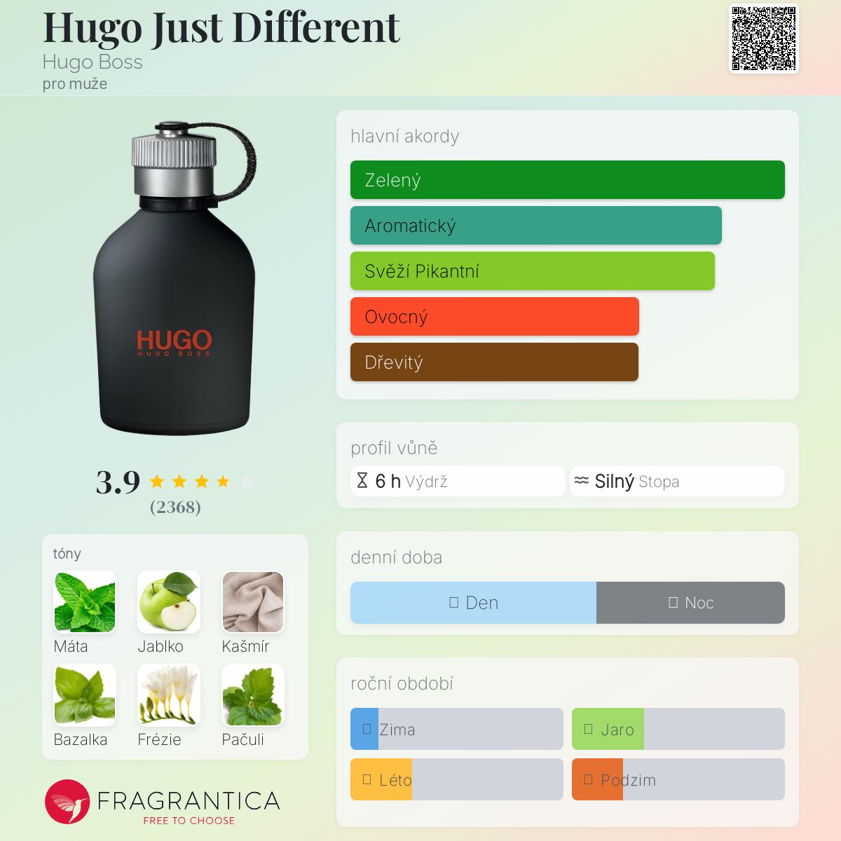 Hugo Just Different podle Hugo Boss je Aromatic vůně pro muže. Hugo Just Different byl/a uveden/a v roce 2011. Vrchní tóny jsou Máta a Granny Smith jablko; střední tóny jsouBazalka, Frézie a Koriandr ; základní tóny jsou Kašmír, Pačuli, Labdanum a Olibanum.