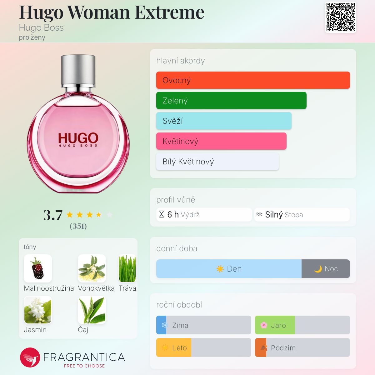 Hugo Woman Extreme podle Hugo Boss je Floral Fruity vůně pro ženy. Hugo Woman Extreme byl/a uveden/a v roce 2016. Vrchní tóny jsou Malinoostružina a Tráva; střední tóny jsouJasmín a Černý čaj ; základní tón je Vonokvětka.