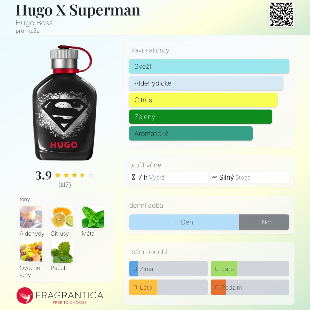 Hugo X Superman podle Hugo Boss je Citrus Aromatic vůně pro muže. Toto je nová vůně. Hugo X Superman byl/a uveden/a v roce 2025. Vrchní tóny jsou Aldehydy, Citrusy a Drobné ovoce; střední tón jeMáta ; základní tón je Pačuli.