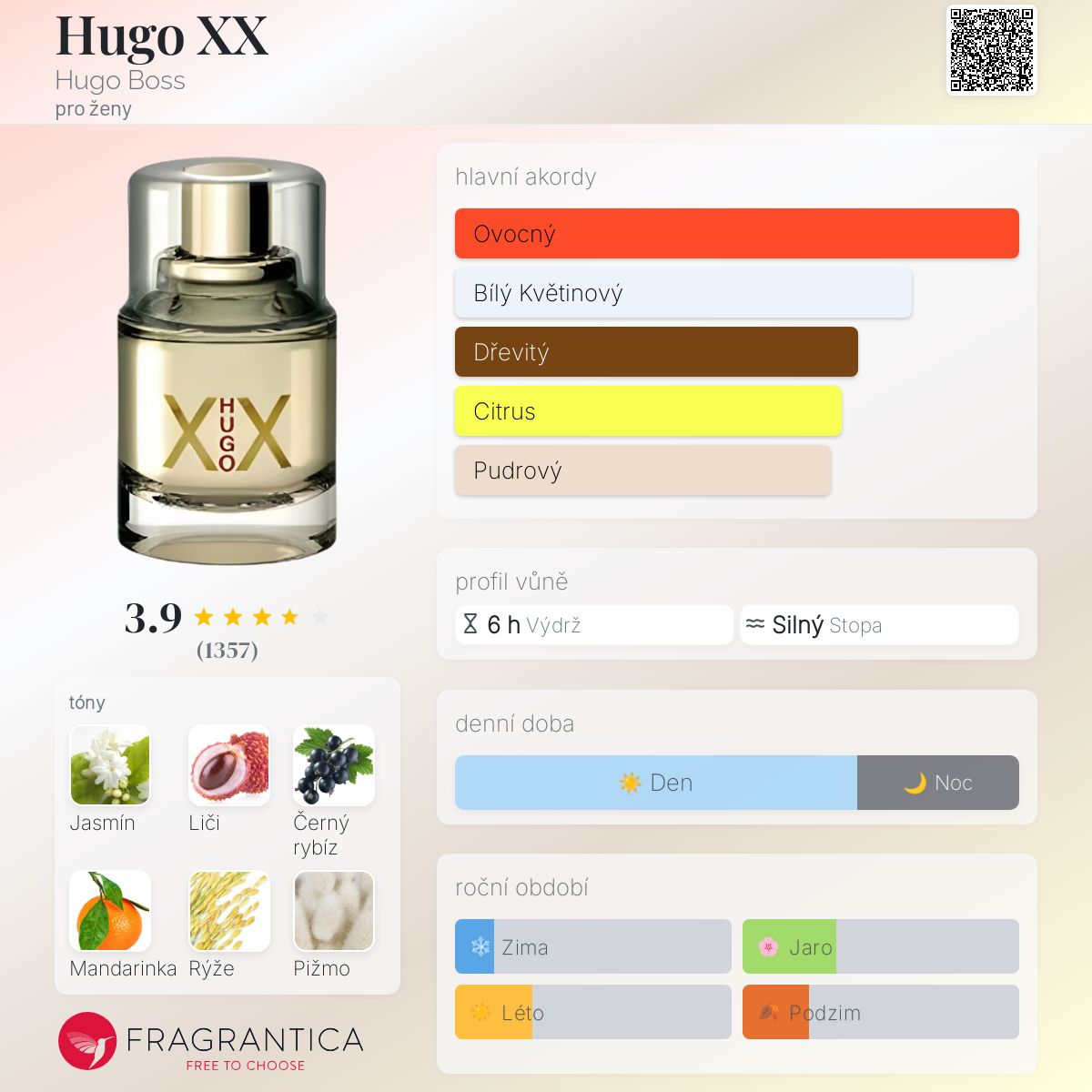 Hugo XX podle Hugo Boss je Floral Fruity vůně pro ženy. Hugo XX byl/a uveden/a v roce 2007. Vrchní tóny jsou Liči, Černý rybíz a Mandarinka; střední tóny jsouJasmín, Rýže basmati a Růže ; základní tóny jsou Pižmo, Santalové dřevo a Jantar (ambra).