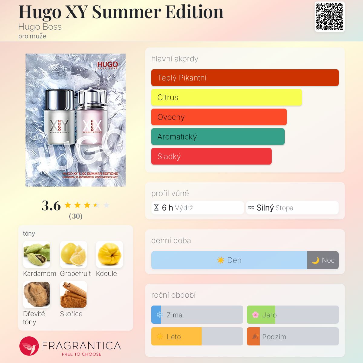 Hugo XY Summer Edition podle Hugo Boss je Woody Aromatic vůně pro muže. Hugo XY Summer Edition byl/a uveden/a v roce 2009. Vrchní tón je Grapefruit ; střední tóny jsouKardamom a Kdoule ; základní tóny jsou Dřevité tóny a Skořice.