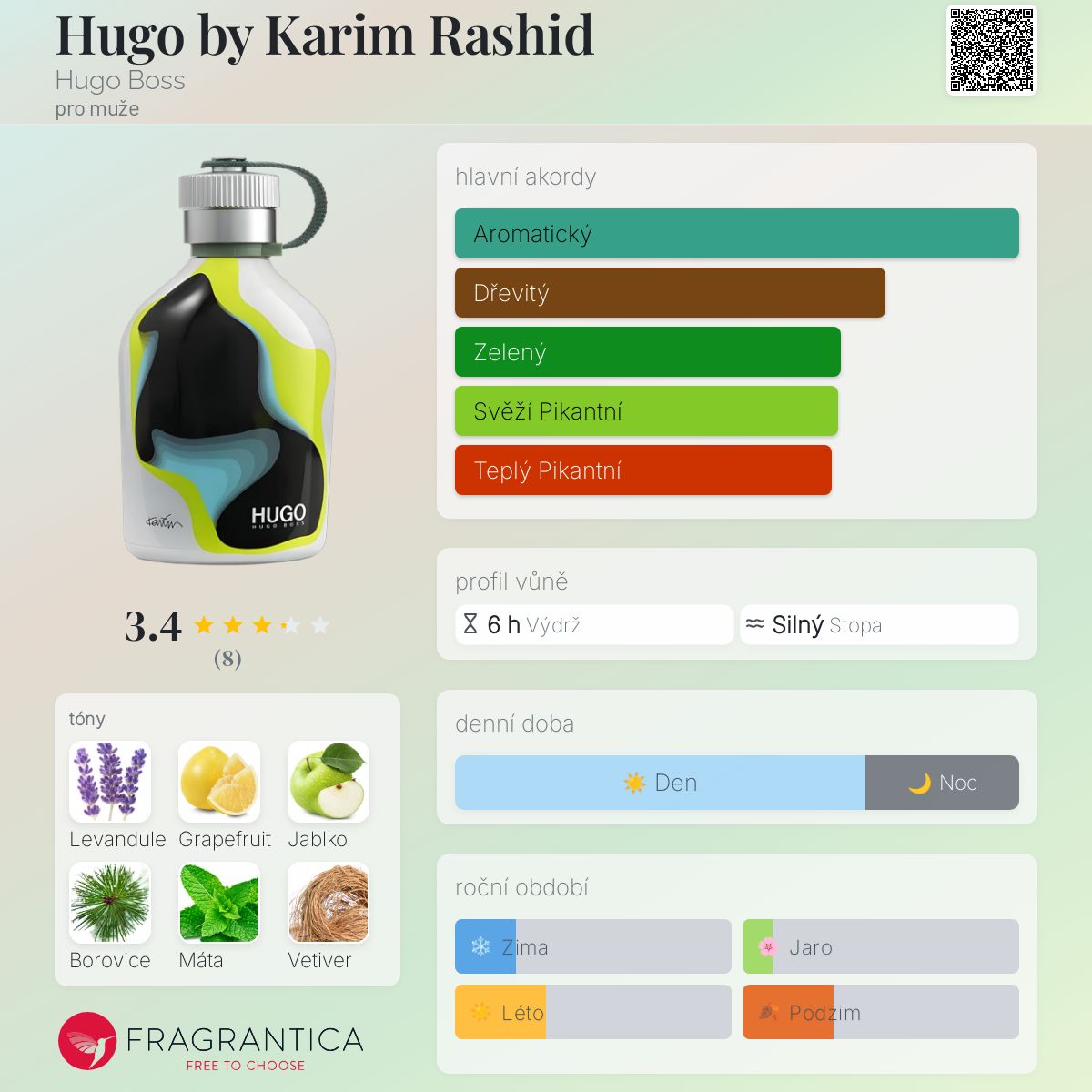 Hugo by Karim Rashid podle Hugo Boss je Aromatic Green vůně pro muže. Hugo by Karim Rashid byl/a uveden/a v roce 2009. "Nosem" za touto vůní je Bob Aliano. Vrchní tóny jsou Levandule, Grapefruit, Granny Smith jablko a Máta; střední tóny jsouKarafiát, Šalvěj, Hřebíček a Pelargónie ; základní tóny jsou Borovice, Vetiver, Dubový mech a Pačuli.