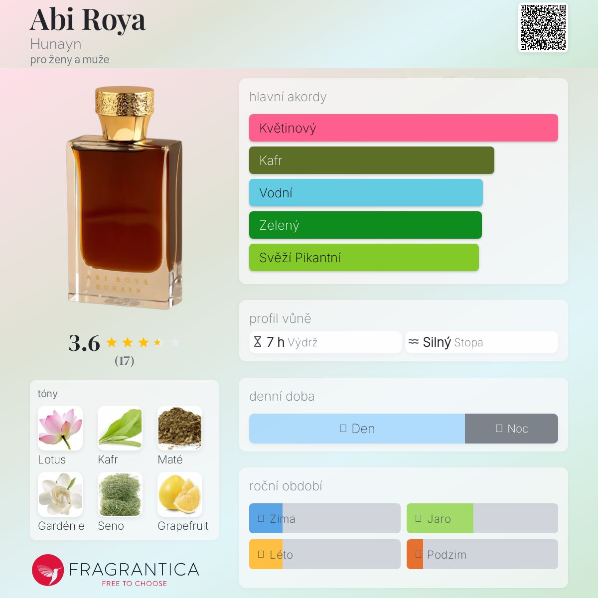 Abi Roya podle Hunayn je Aromatic vůně pro ženy a muže. Toto je nová vůně. Abi Roya byl/a uveden/a v roce 2024. "Nosem" za touto vůní je Adill Ali. Vrchní tóny jsou Kafr, Grapefruit a Jalovcové bobulky; střední tóny jsouBílý lotos, Modrý lotos, Růžový lotos, Gardénie a Mimóza ; základní tóny jsou Maté, Seno a Cedr.