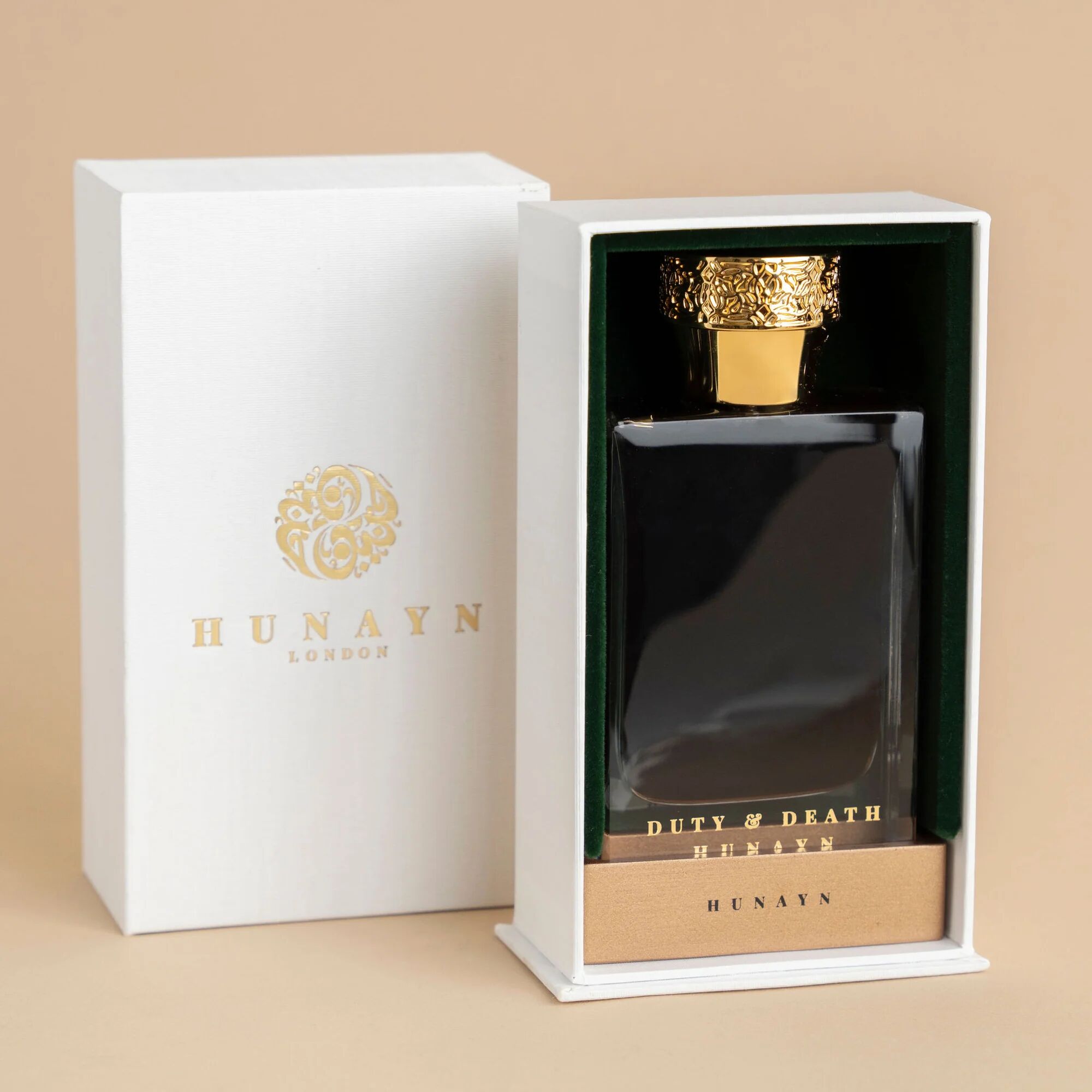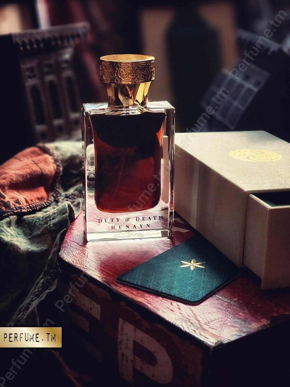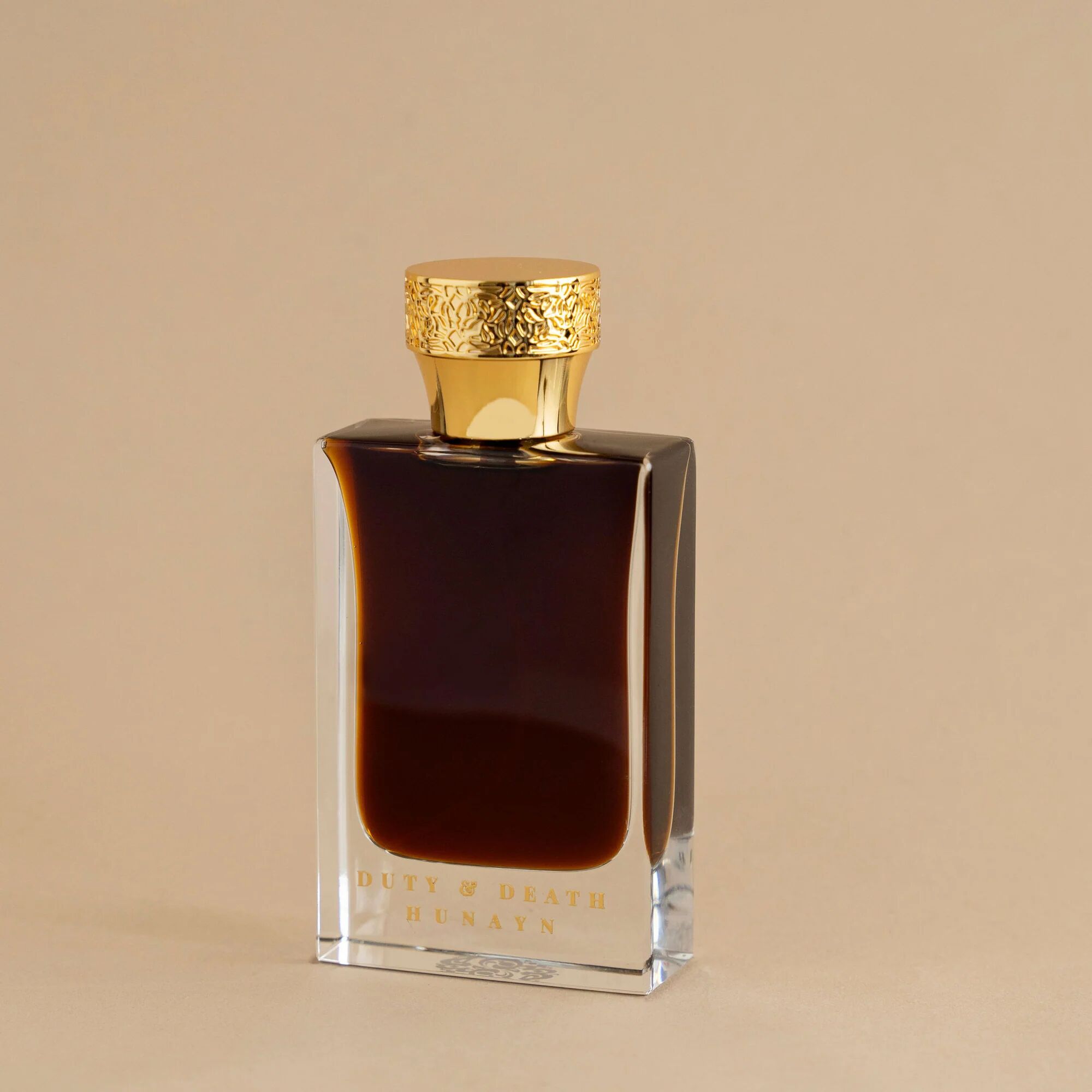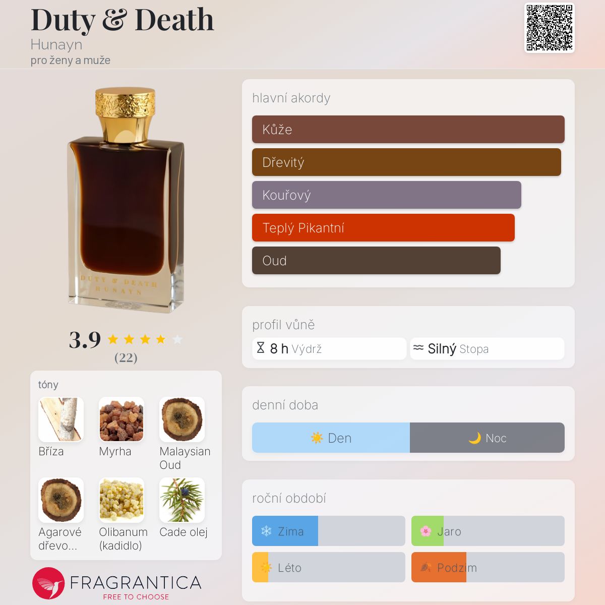 Duty & Death podle Hunayn je Aromatic Spicy vůně pro ženy a muže. Toto je nová vůně. Duty & Death byl/a uveden/a v roce 2024. "Nosem" za touto vůní je Adill Ali. Vrchní tóny jsou Bříza, Cade olej, Černý pepř, Šafrán, Hřebíček, Skořice a Rum; střední tóny jsouMyrha, Bílý oud, Shamama Attar, Šafrán, Jasmín, Vanilka, Zázvor a Fazole tonka ; základní tóny jsou Malajský oud, Agarové dřevo (oud), Kadidlo, Santalové dřevo, Vetiver, Cypriolový olej a Pačuli.