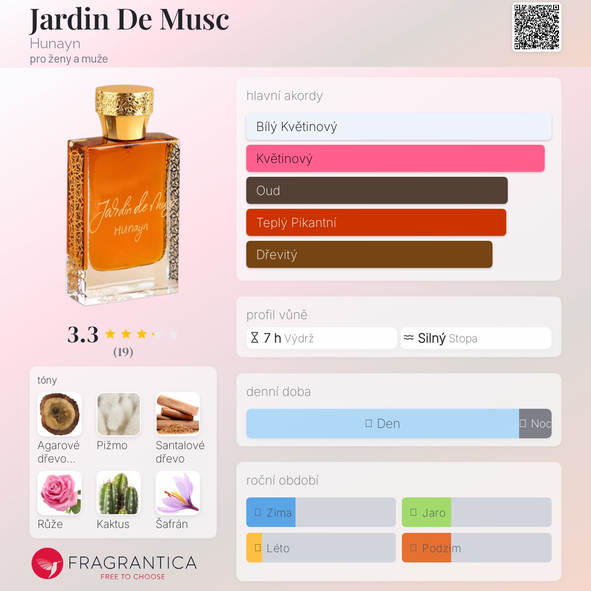 Jardin De Musc podle Hunayn je vůně pro ženy a muže. Toto je nová vůně. Jardin De Musc byl/a uveden/a v roce 2024. "Nosem" za touto vůní je Adill Ali.