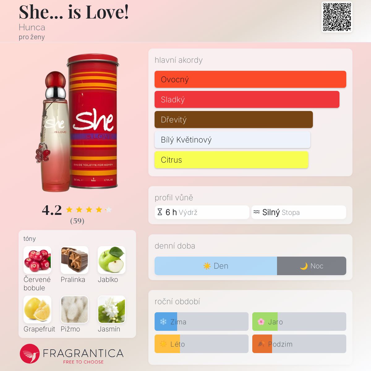 She... is Love! podle Hunca je Floral Fruity Gourmand vůně pro ženy. She... is Love! byl/a uveden/a v roce 2007. Vrchní tóny jsou Červené bobule, Granny Smith jablko, Grapefruit a Citron amalfi; střední tóny jsouJasmín, Gardénie a Frézie ; základní tóny jsou Pralinka, Pižmo, Vlašský ořech, Virginský cedr a Santalové dřevo.