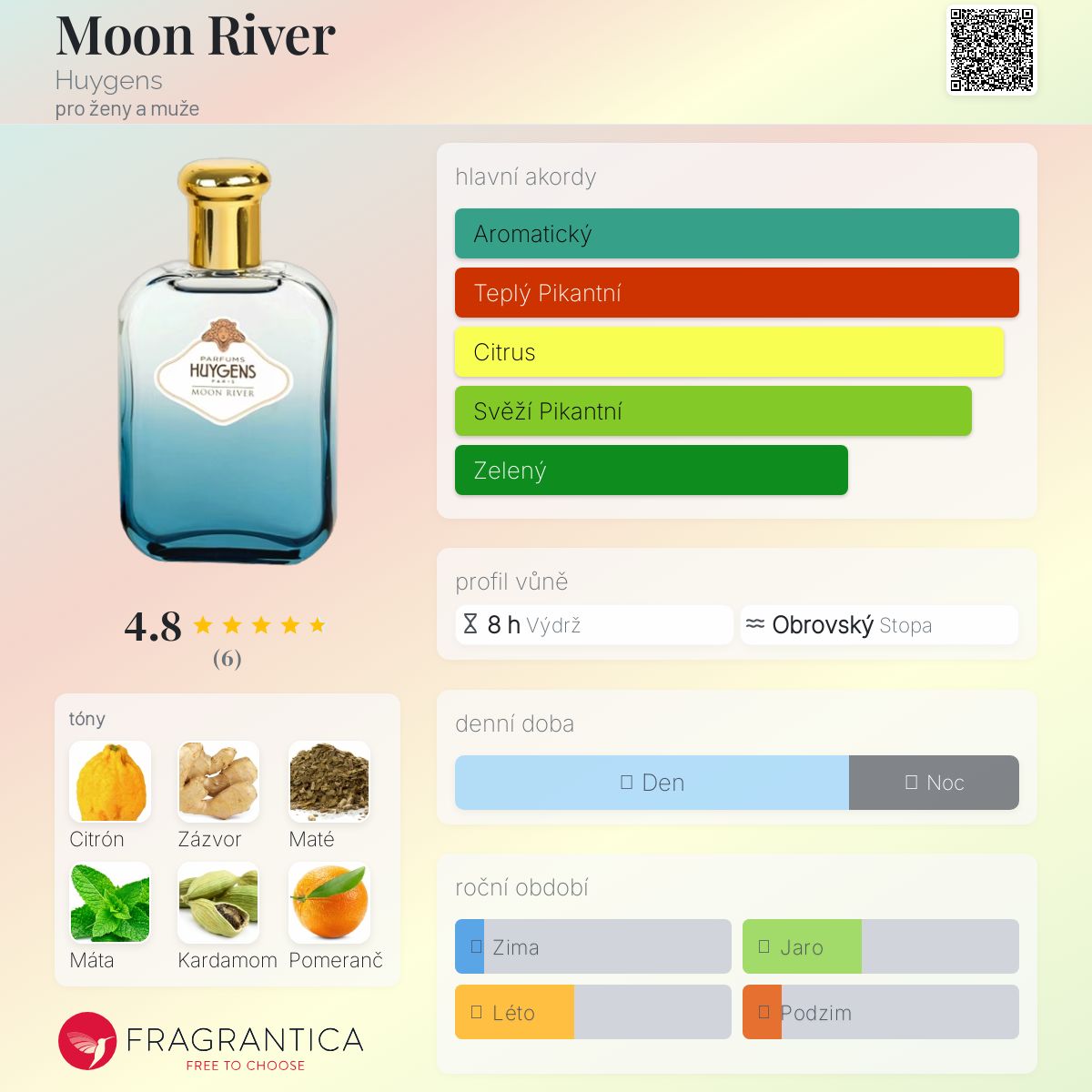 Moon River podle Huygens je vůně pro ženy a muže. Moon River byl/a uveden/a v roce 2018. "Nosem" za touto vůní je Corinne Cachen. Vrchní tóny jsou Citrón, Máta, Pomeranč a Neroli; střední tóny jsouZázvor, Kardamom, Pelargónie a Pepř ; základní tóny jsou Maté a Cedr.