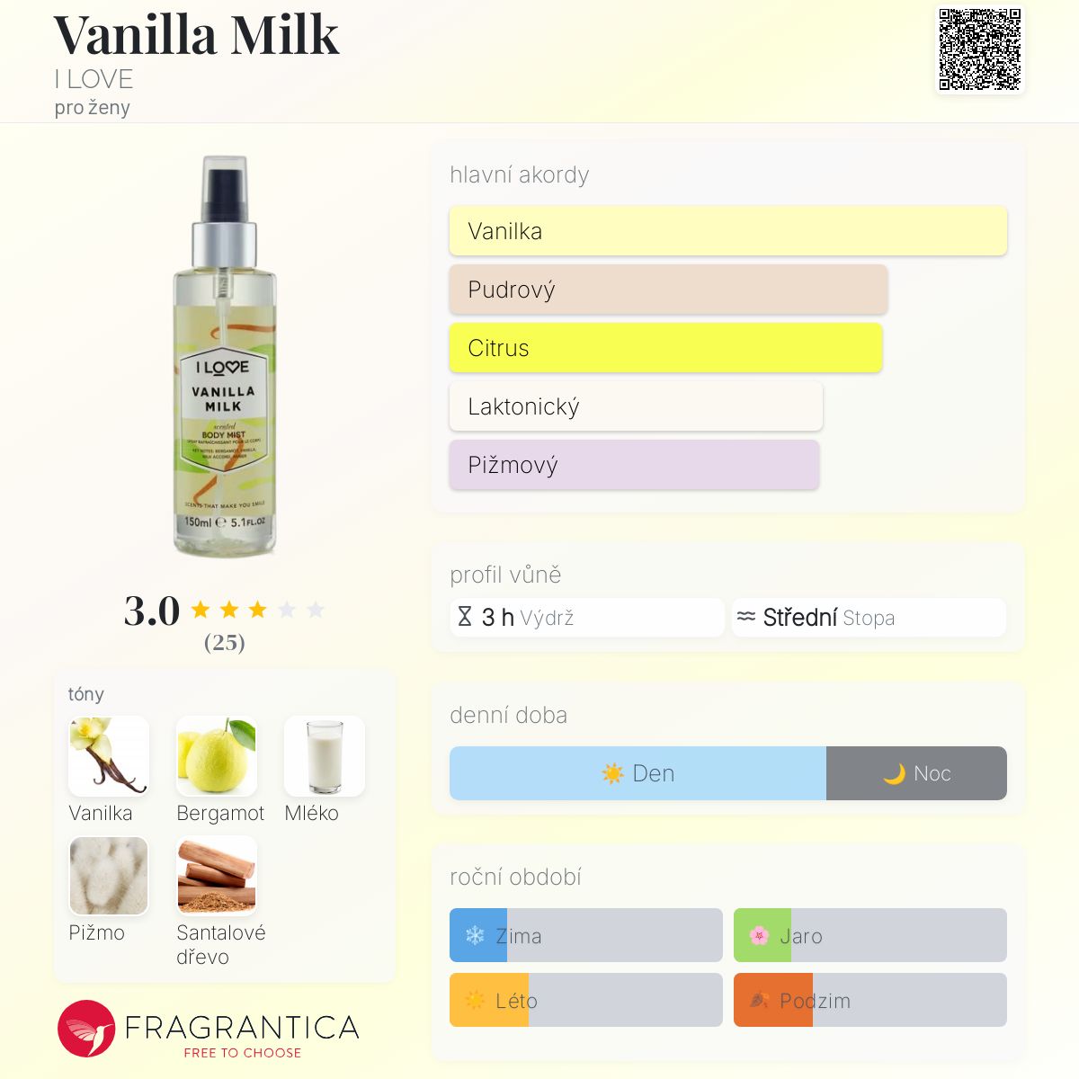 Vanilla Milk podle I LOVE je vůně pro ženy. Vrchní tóny jsou Bergamot a Mléko; střední tóny jsouVanilka, Mléko a Santalové dřevo ; základní tóny jsou Vanilka, Pižmo a Santalové dřevo.
