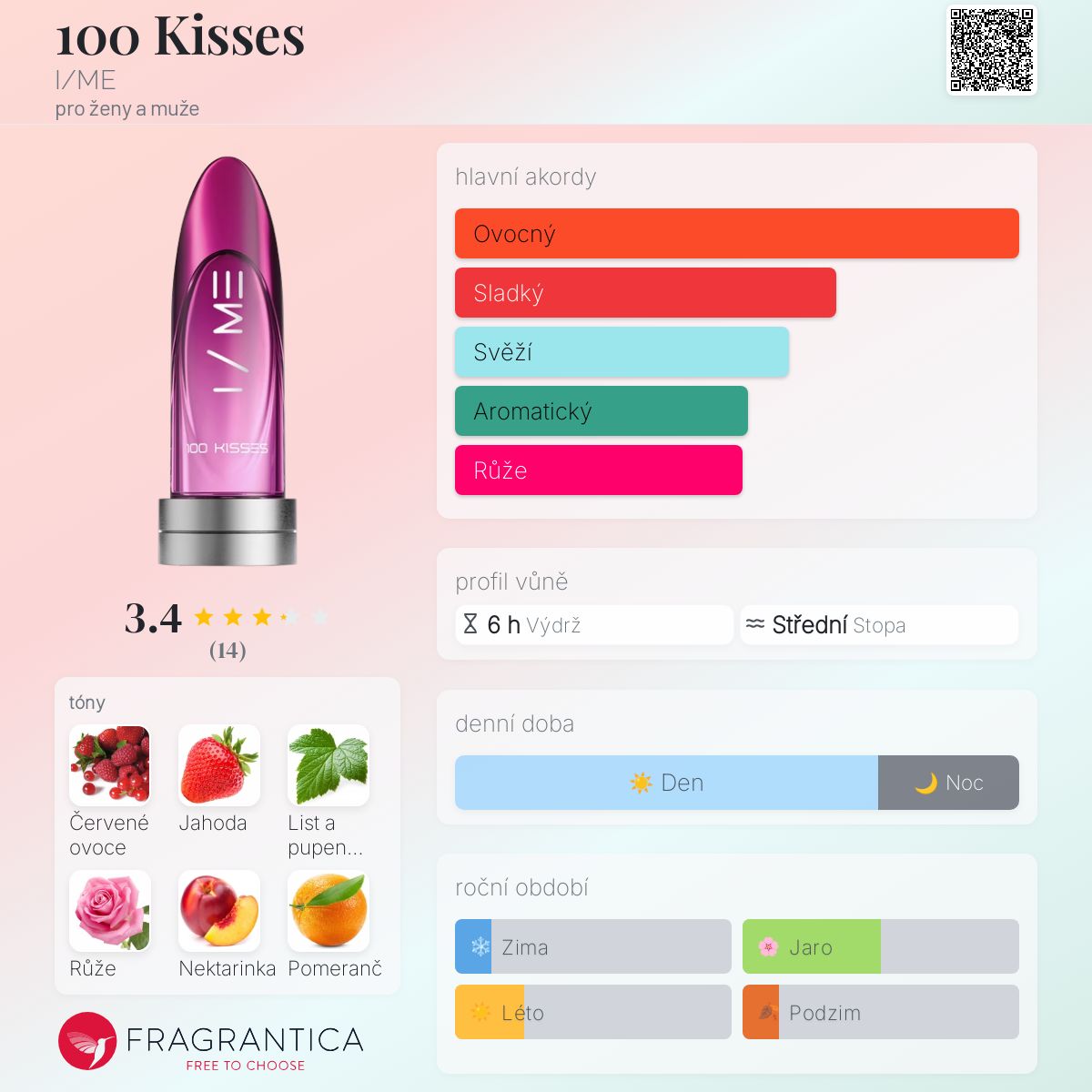 100 Kisses podle I/ME je Floral Fruity Gourmand vůně pro ženy a muže. Toto je nová vůně. 100 Kisses byl/a uveden/a v roce 2025. Vrchní tóny jsou Jahoda, Černý rybíz, Nektarinka a Pomeranč; střední tóny jsouČervené ovoce, Růže, Konvalinka a Květ jabloně ; základní tóny jsou Fazole tonka, Jantar (ambra) a Vanilka.