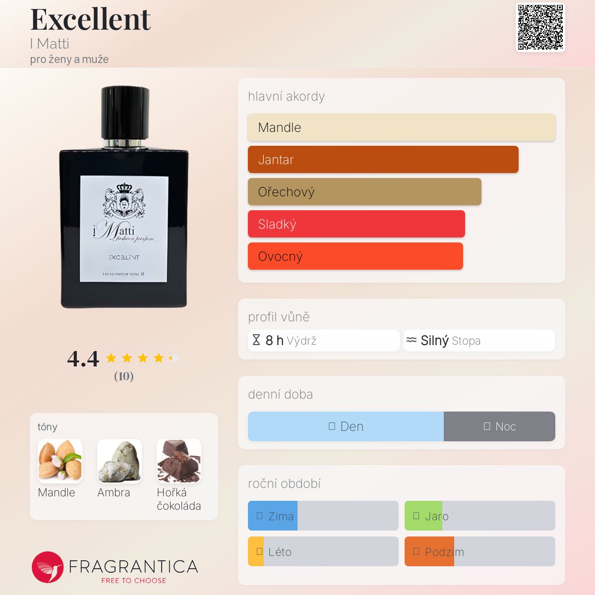 Excellent podle I Matti je vůně pro ženy a muže. Vrchní tón je Čokoláda ; střední tón jeAmbra ; základní tón je Mandle.