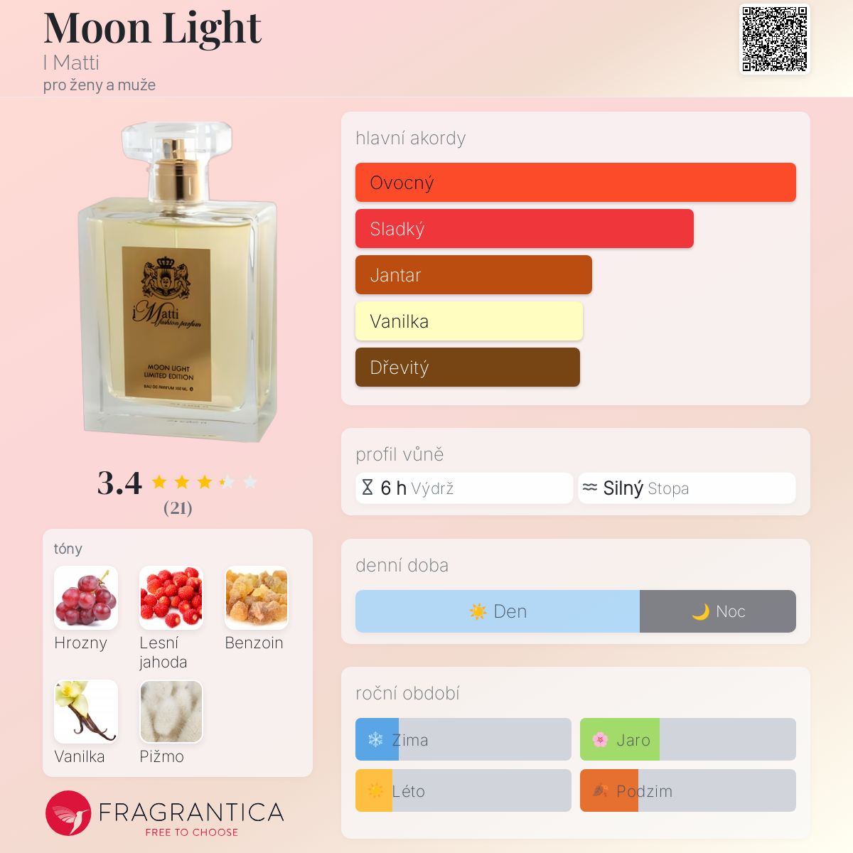 Moon Light podle I Matti je vůně pro ženy a muže. Moon Light byl/a uveden/a v roce 2023. Vrchní tón je Lesní jahoda ; střední tón jeHrozny ; základní tóny jsou Benzoin, Vanilka a Pižmo.