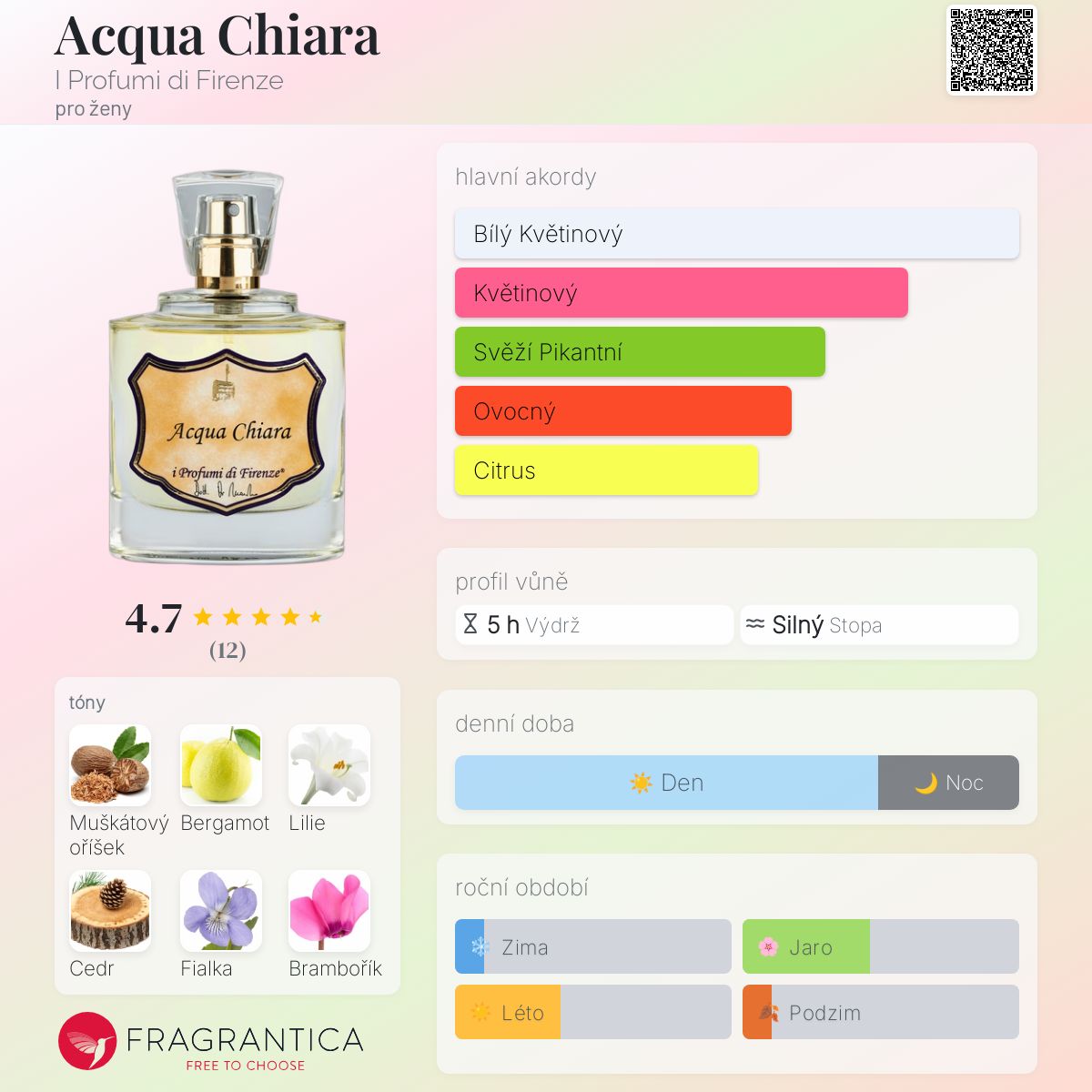 Acqua Chiara podle I Profumi di Firenze je Floral vůně pro ženy. Acqua Chiara byl/a uveden/a v roce 2000. "Nosem" za touto vůní je Giovanni Di Massimo. Vrchní tón je Bergamot ; střední tóny jsouMuškátový oříšek, Lilie, Fialka, Brambořík a Broskev ; základní tóny jsou Cedr, Vanilka a Pačuli.