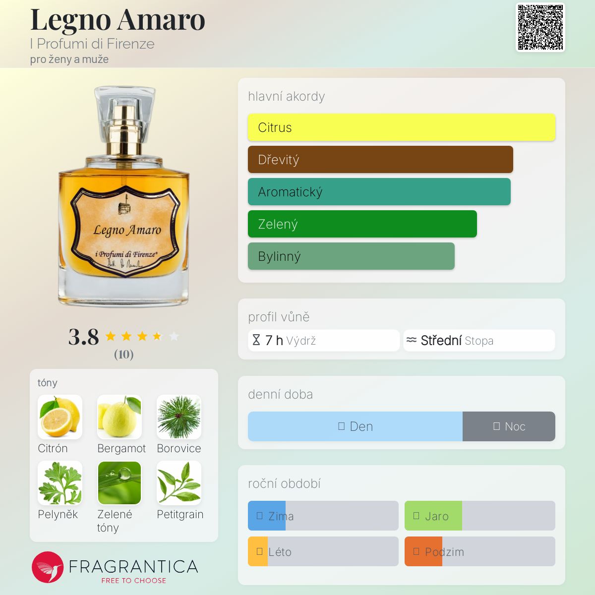 Legno Amaro podle I Profumi di Firenze je Woody vůně pro ženy a muže. "Nosem" za touto vůní je Giovanni Di Massimo. Vrchní tóny jsou Citrón, Bergamot, Borovice, Pelyněk a Bylinné tóny; střední tóny jsouPetitgrain, Kořeněné tóny a Květinové tóny ; základní tóny jsou Dřevité tóny, Citronová verbena, Dubový mech a Zvířecí tóny.